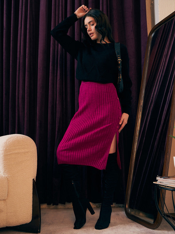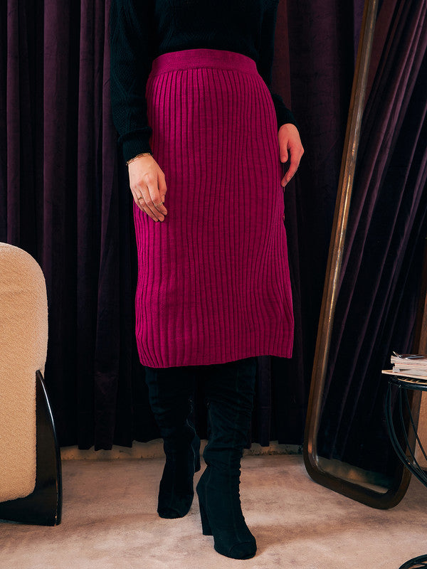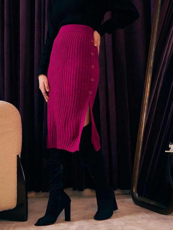 Introducing Berrylush's latest creation, this sophisticated Solid Pink Pencil Midi Skirt is a must-have for your wardrobe. Crafted with a chic high-rise waist and an effortless slip-on design complemented by a subtle button closure, it ensures both comfort and style. The skirt features an elegant ribbed texture in a charming pink shade that adds flair to its streamlined silhouette. Perfectly knitted to ensure opacity, it boasts an alluring side-slit on the straight hemline adding just the right amount of edge. Embrace versatility where luxury meets convenience with this stunning midi skirt — ideal for both office charm and evening grace.