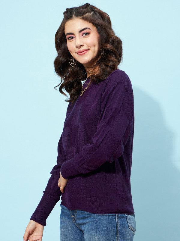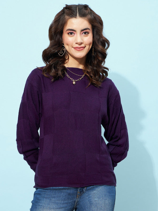 Berrylush Women Solid Purple Boat Neck Drop-Shoulder Sleeves Acrylic Ribbed Hem Knitted Regular Sweater