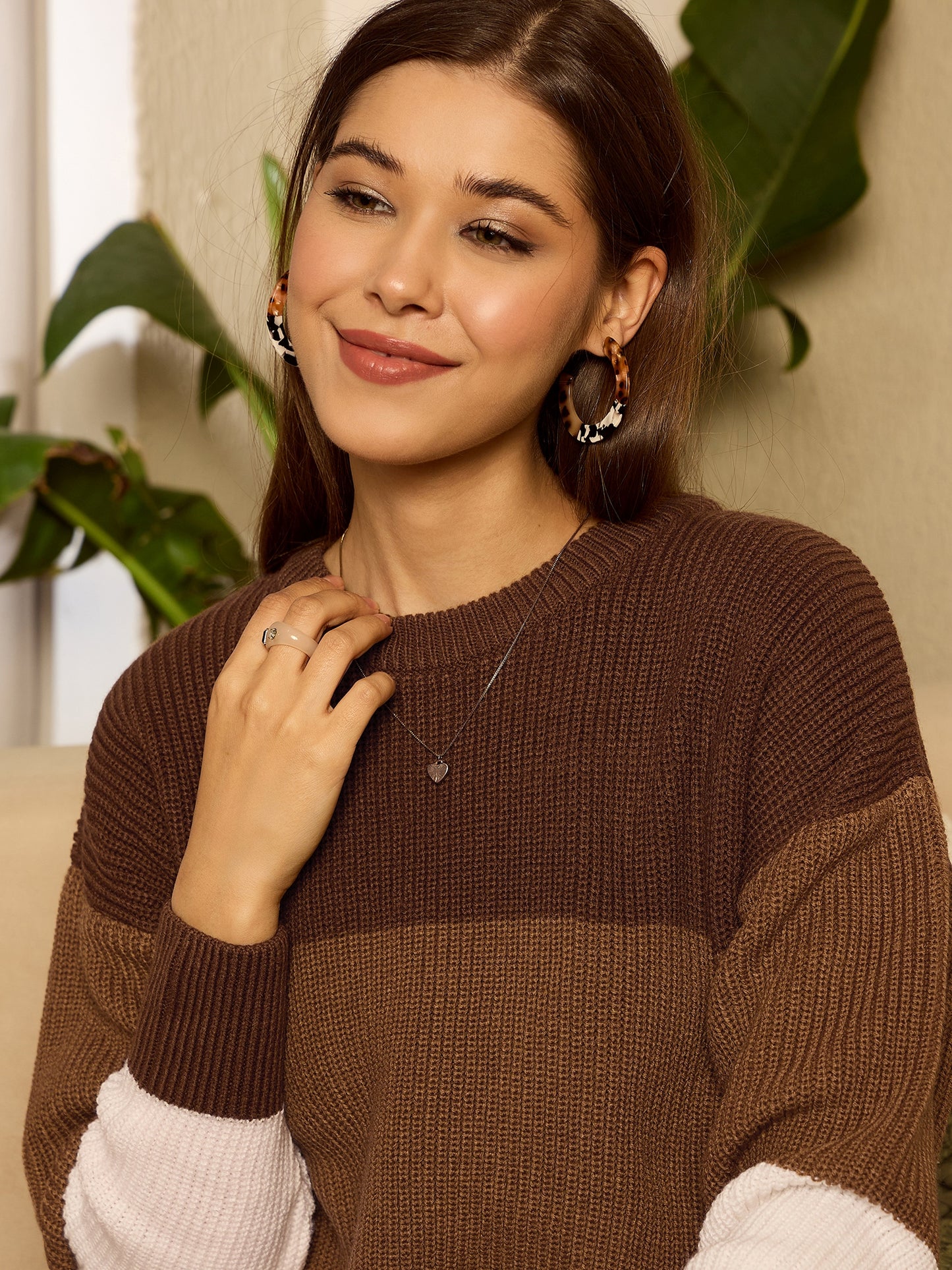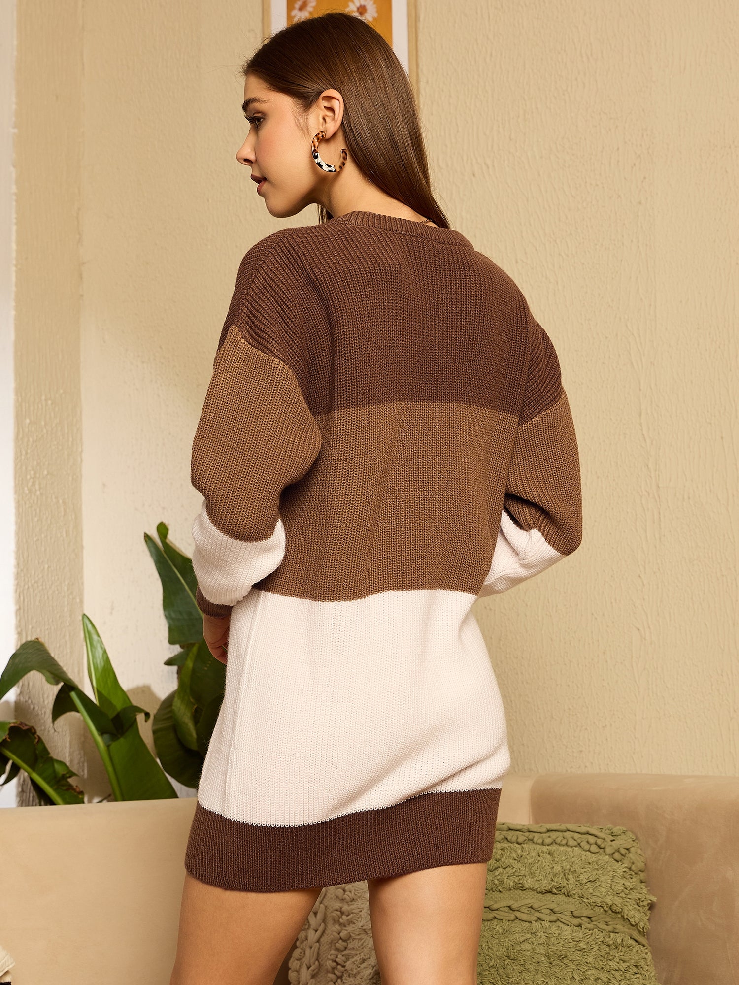 Experience a perfect blend of comfort and style with the Berrylush Brown & White Colourblocked Pattern Round Neck Drop-Shoulder Sleeves Knitted Longline Pullover. Crafted from soft, high-quality acrylic, this pullover offers warmth without compromising on breathability, making it an ideal choice for any casual outing. The striking colour-blocked design in earthy tones of brown and crisp white adds a modern twist to your everyday look. Designed with long drop-shoulder sleeves and a flattering round neckline, this longline garment drapes beautifully over your silhouette for an effortlessly chic appearance. The straight hemline ensures easy pairing with jeans or leggings while providing ample coverage. Whether you're meeting friends for coffee or enjoying a leisurely stroll around town, this opaque knitted piece enhances any ensemble while offering day-long comfort.