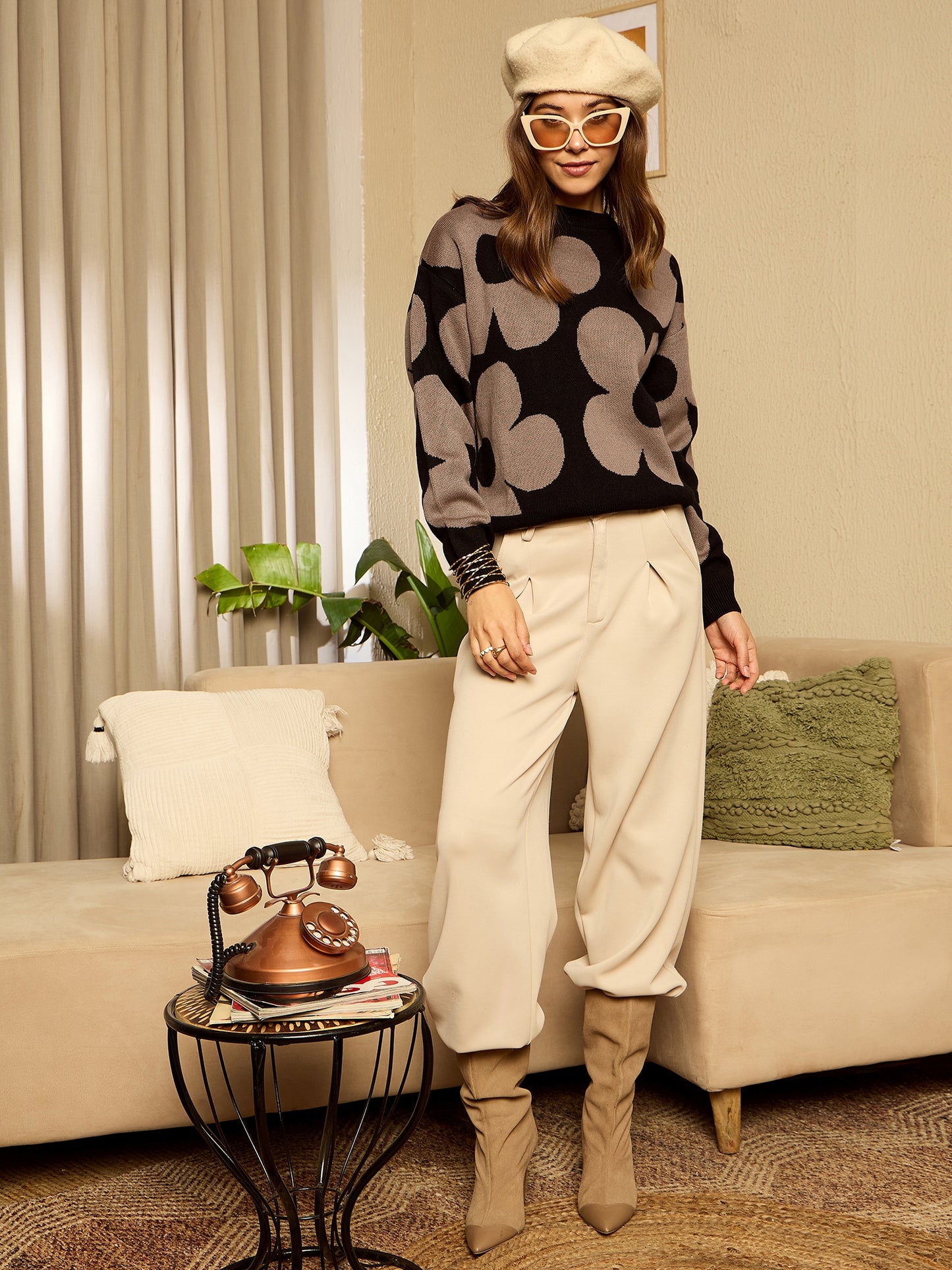 Berrylush Women Black & Brown Floral Printed Round Neck Drop-Shoulder Sleeves Acrylic Ribbed Hem Regular Pullover