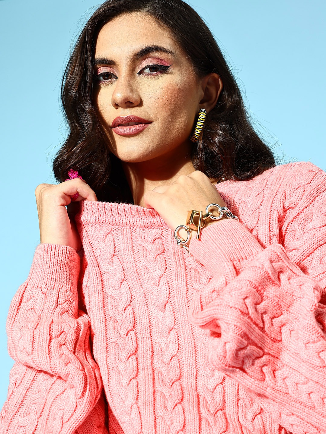 Berrylush Women Light Pink Cable Knit Pattern Round Neck Drop-shoulder Sleeve Ribbed Hem Regular Pullover