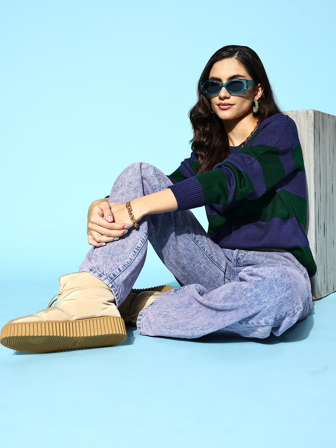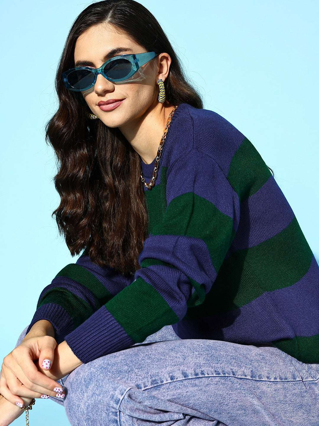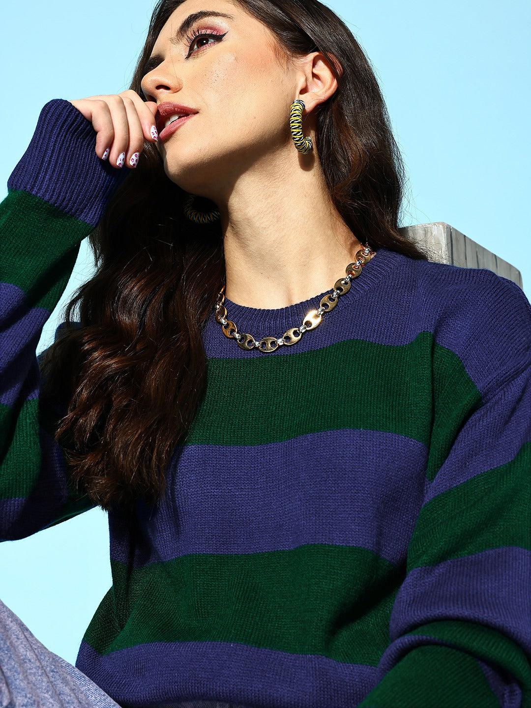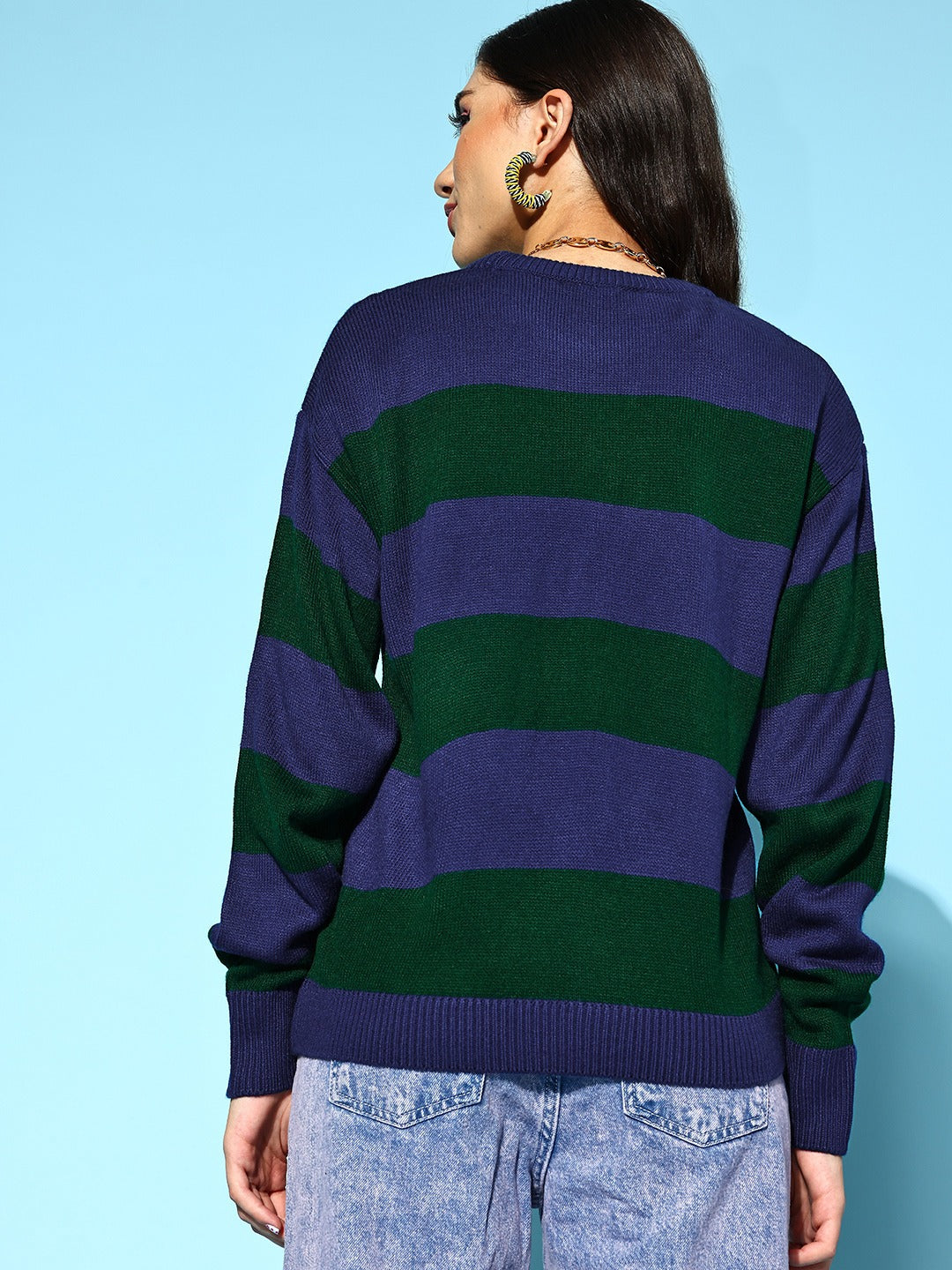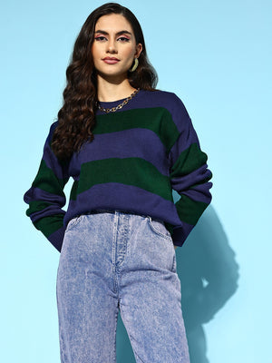 Berrylush Women Blue & Green Striped Pattern Round Neck Polyester Ribbed Hem Regular Pullover