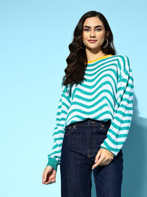 Berrylush Women Blue & White Striped Pattern Round Neck Drop-Shoulder Sleeve Ribbed Hem Regular Pullover