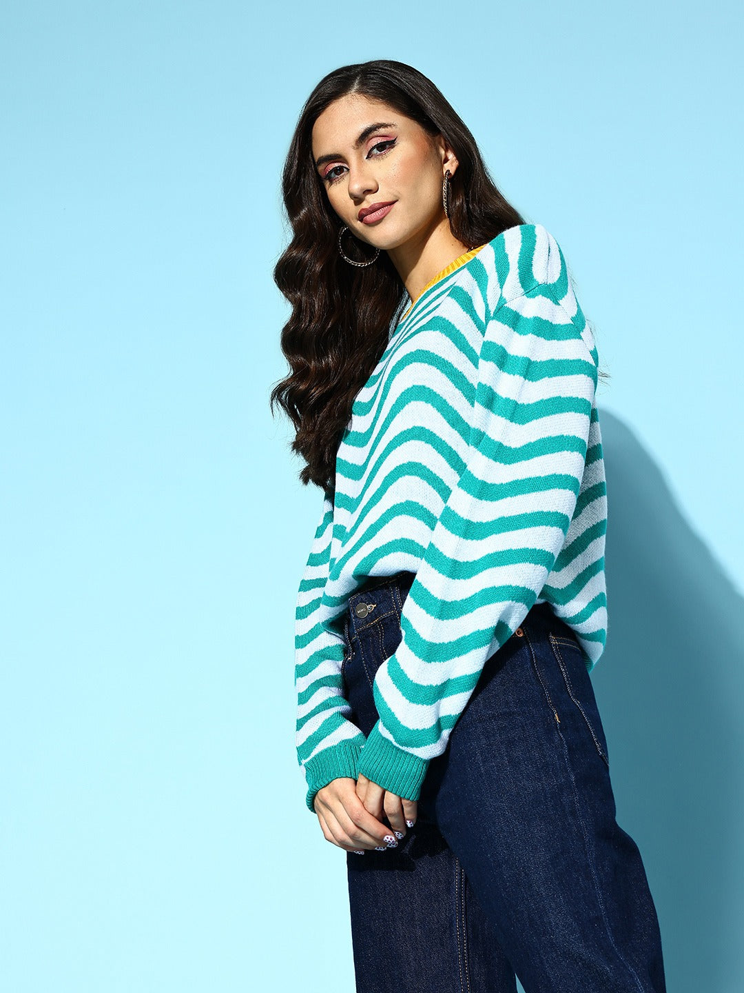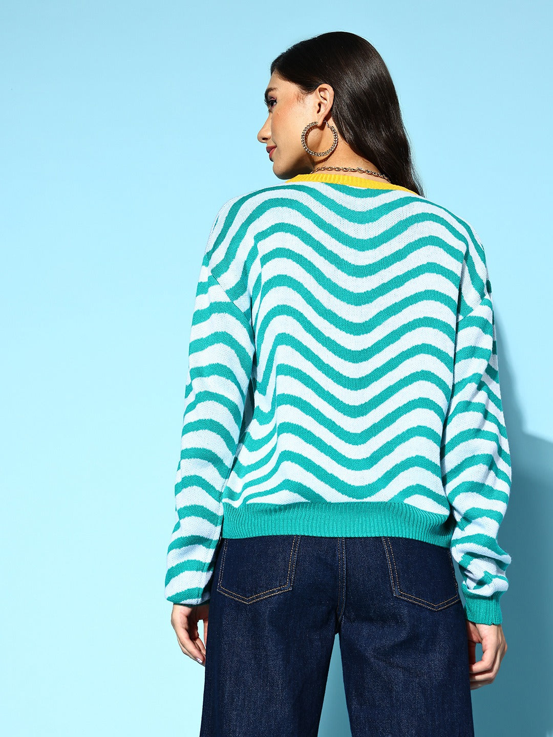 Enhance the glam of your autumn contingent with some striking and fun statement pieces just like this bedazzling Striped Blue and White Round Neck Ribbed Hem Regular Pullover introduced by Berrylush from its pullover collection. Adorned with a beautiful amalgamation of blue and white shade that gives this pullover an eye-catching design while giving away a cinematic ritzy vibe. Flaunting long drop-shoulder sleeves that offer your arms attractive coverage to keep them cosy for a prolonged duration. Comes in regular length which lends this pullover a dash of realistic design with a smart appearance to your upper body. Team up this pullover with blue denim jeans, silver hoop earrings, trendy brown boots, and your favourite handbag for a stunning look to meet up with your best friend on weekend.