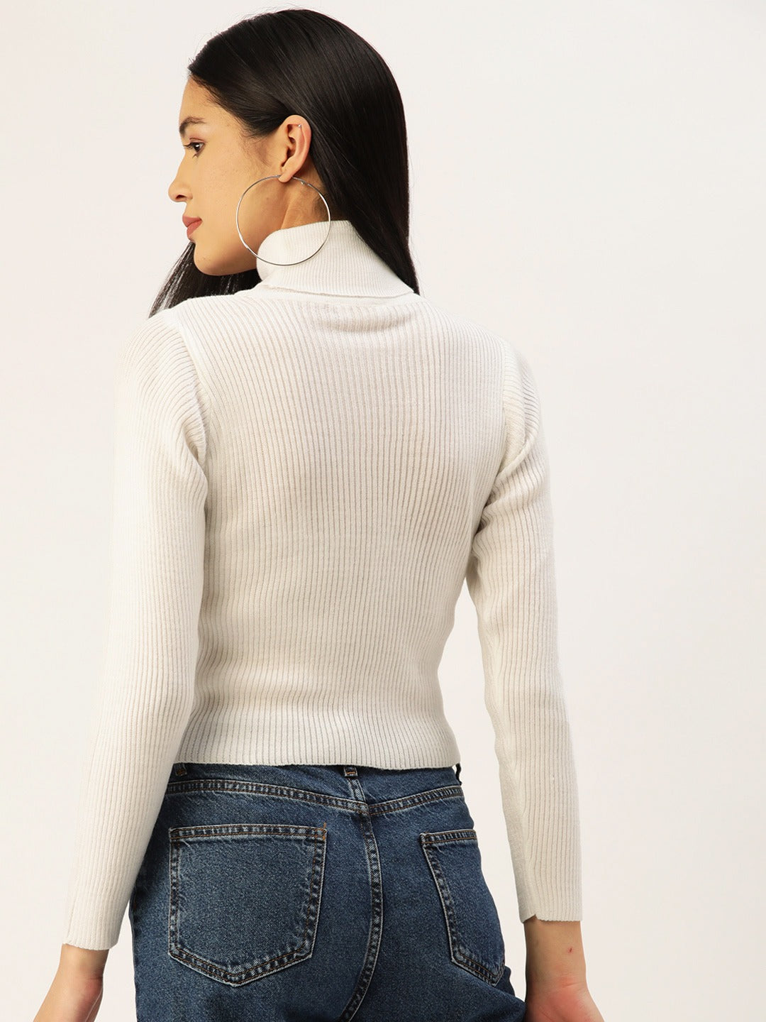 Fill your winter closet with perfect seasonal-inspired style and a touch of modernity just like this timeless Solid White Turtle Neck Ribbed Regular Sweater designed by Berrylush. Displaying turtle neck design elegantly accentuates your face while tucking in your neck with a smart and sleek appeal. The ribbed hemline lends this sweater helps to keep the cold out and retain warmth. Moreover, the regular length offers your upper body complete coverage with a modest appearance and functional style note. Be ready for casual or semi-formal events gorgeously by wearing this sweater with black trousers, a pair of high heels, silver stud earrings, and a classy side bag.