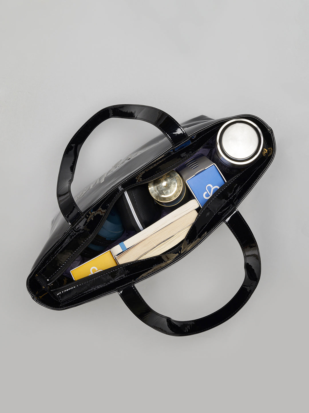 Berrylush Women Solid Black Synthetic Leather Two-Handles Zipper-Up Logo Embroidered Tote Bag