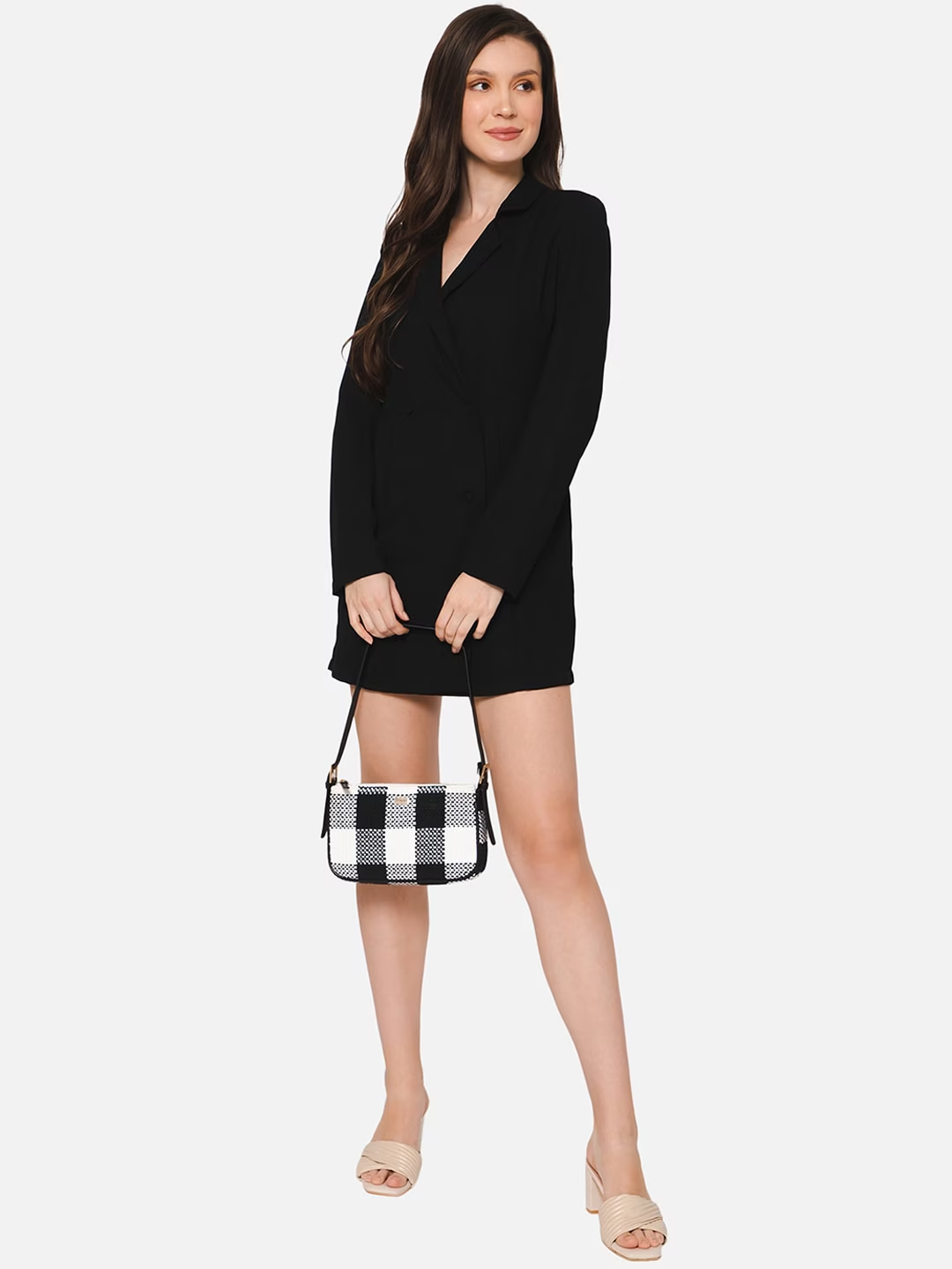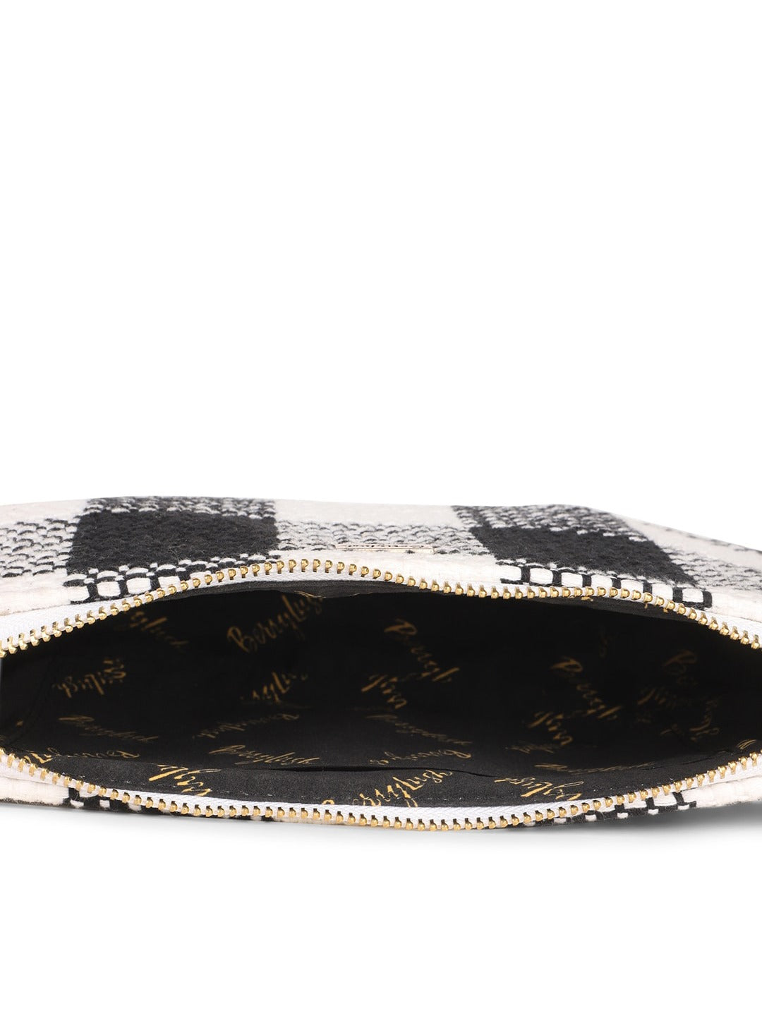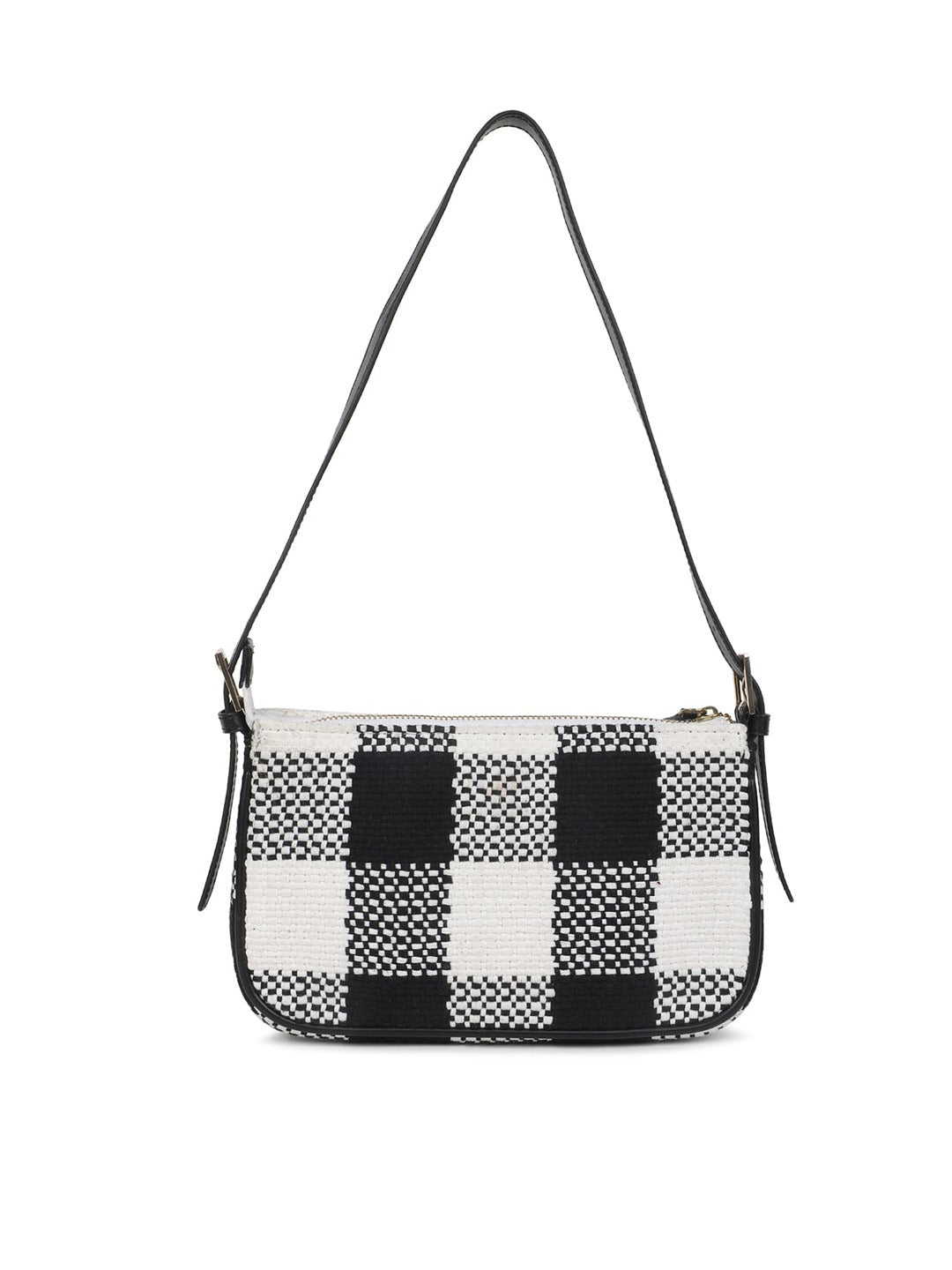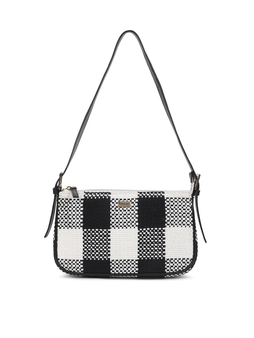 Berrylush Women Black & White Checked Pattern Cotton Zipper-Up Structured Handheld Bag