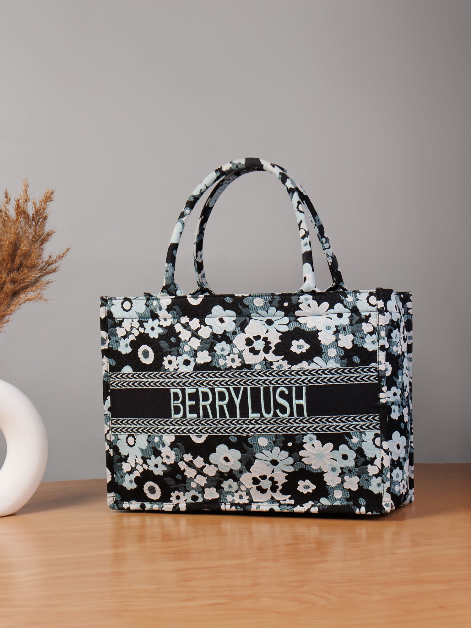 Berrylush Women Black & White Floral Printed Polyester Zipper-Up Embroidered Tote Bag