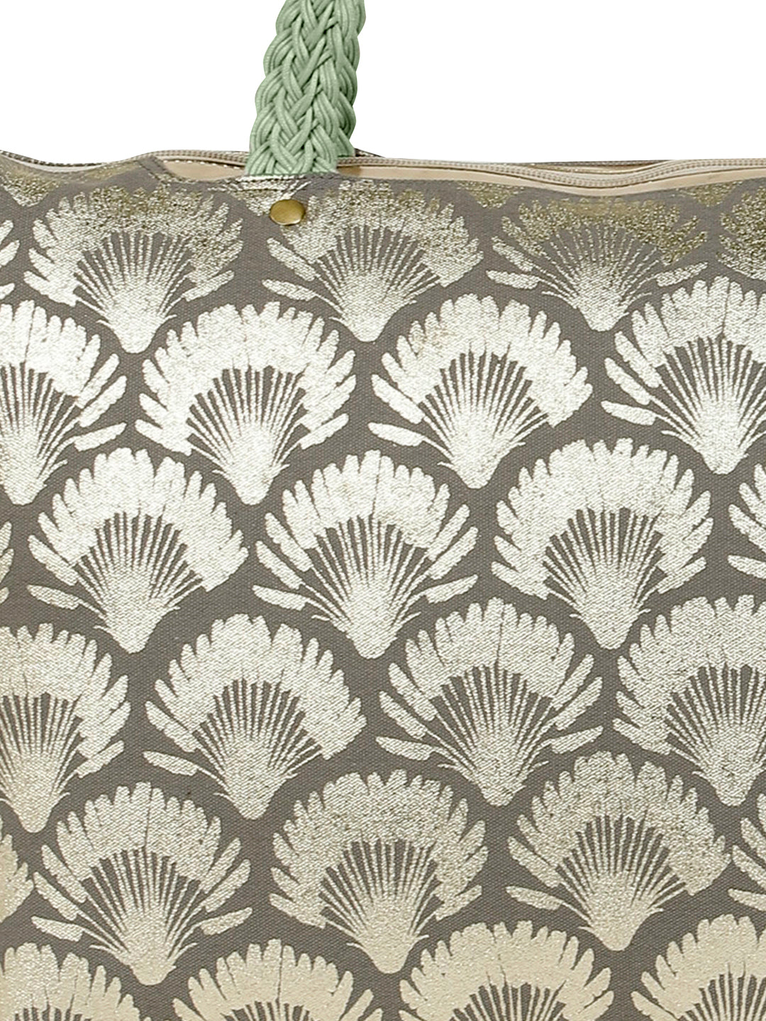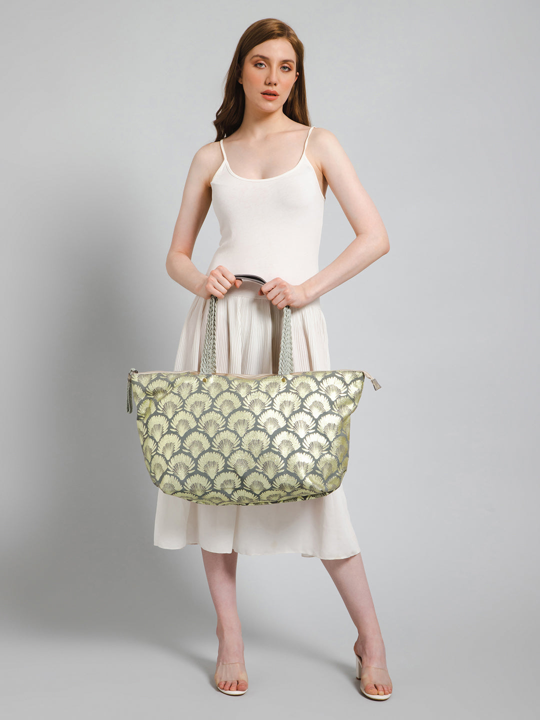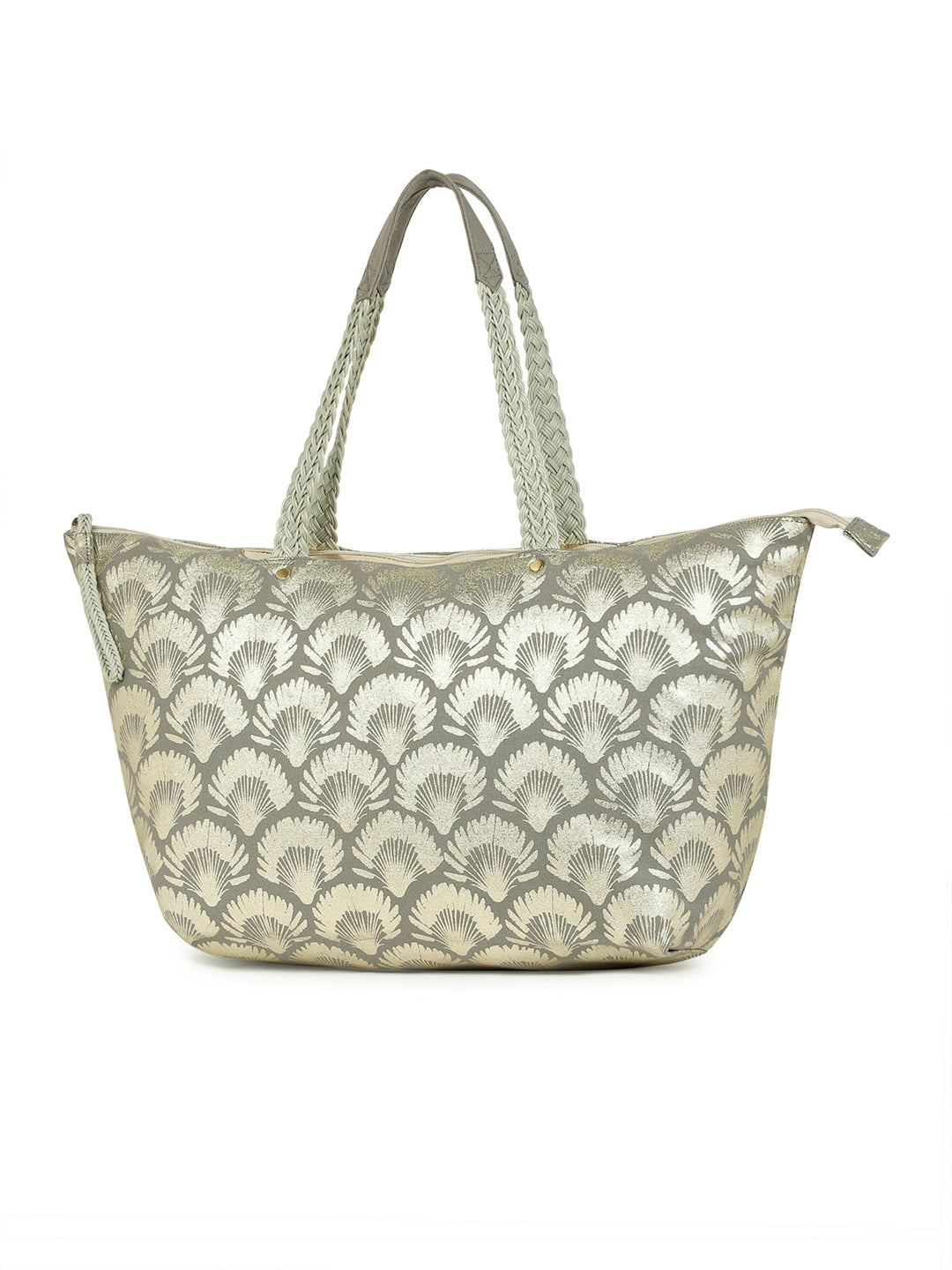 Berrylush Women Grey & Silver Floral Printed Canvas Zipper-Up Oversized Tote Bag