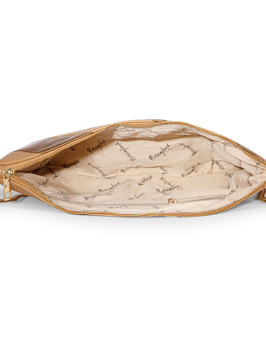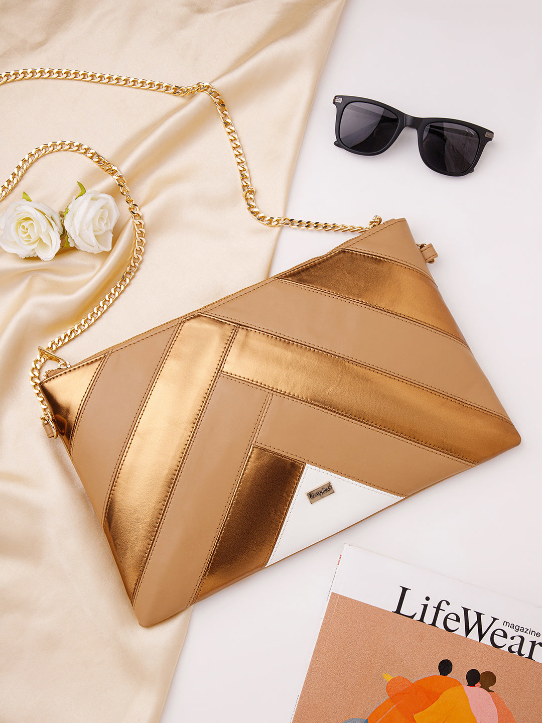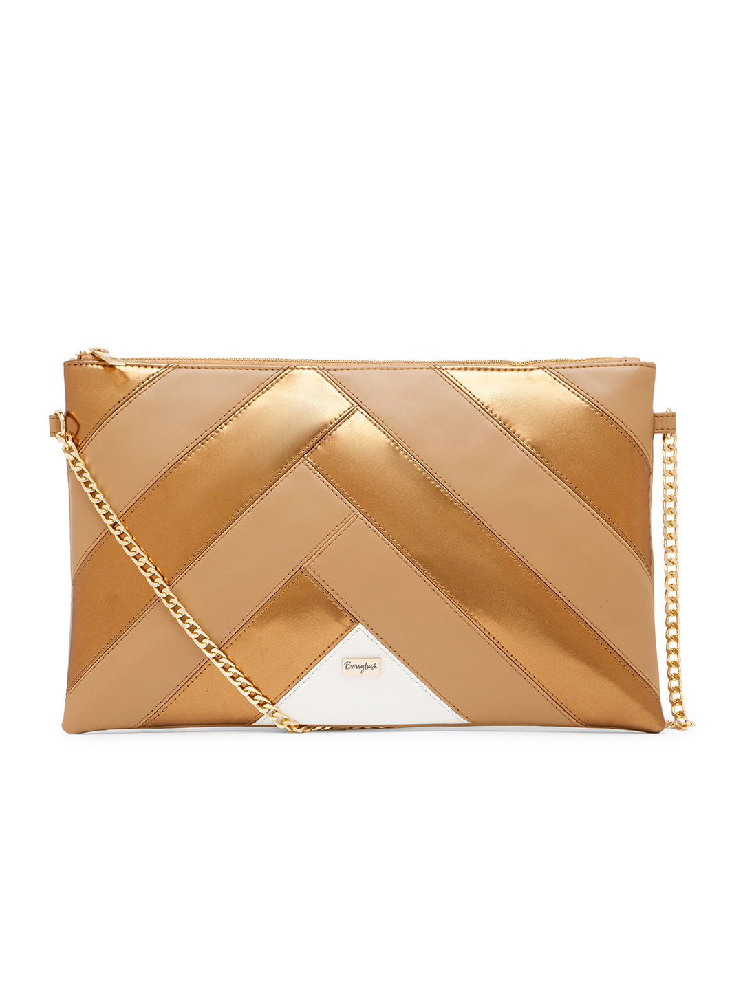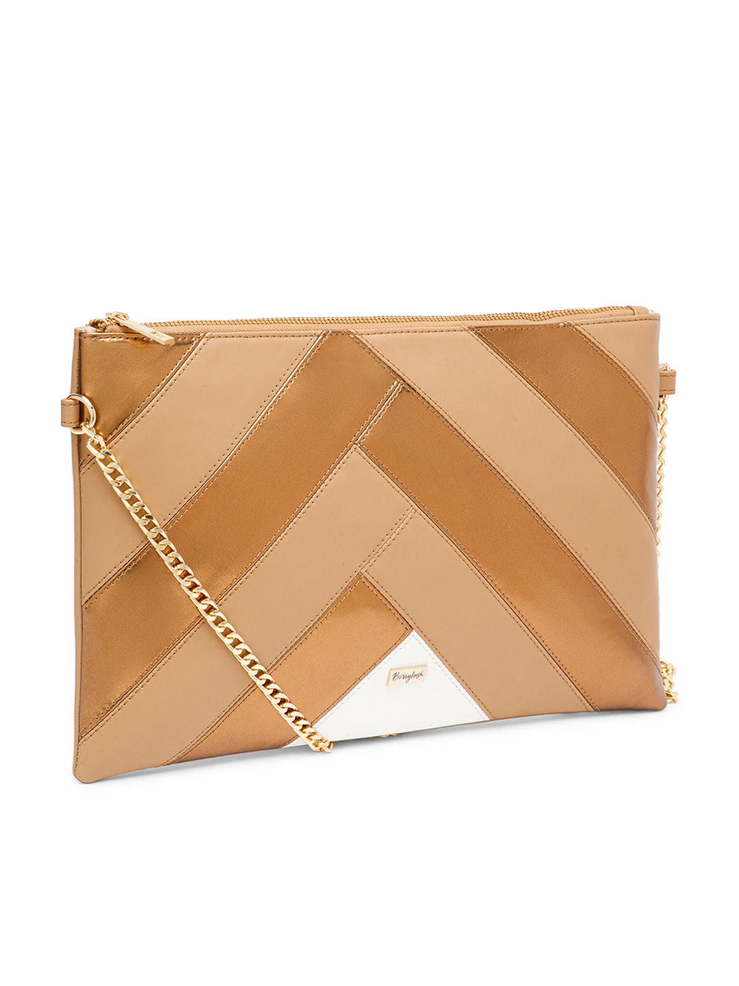 Berrylush Women Striped Beige & Gold Synthetic Leather Detachable Sling Strap Zipper-Up Pouch Bag
