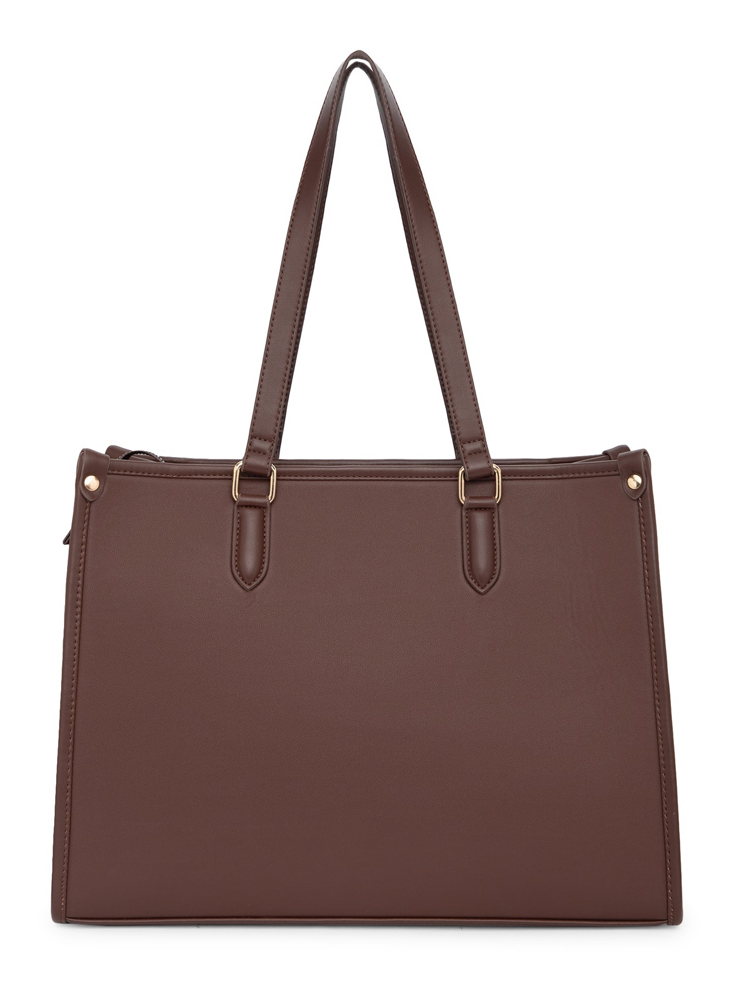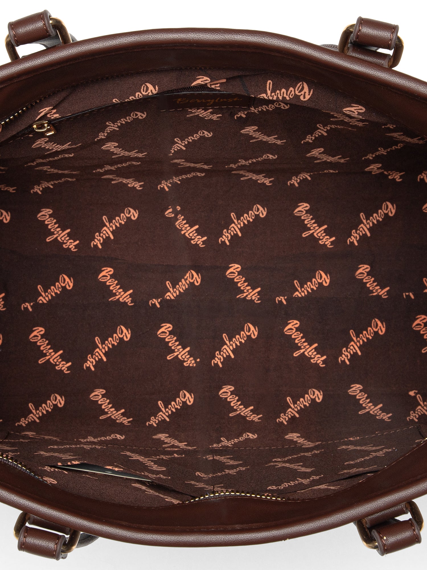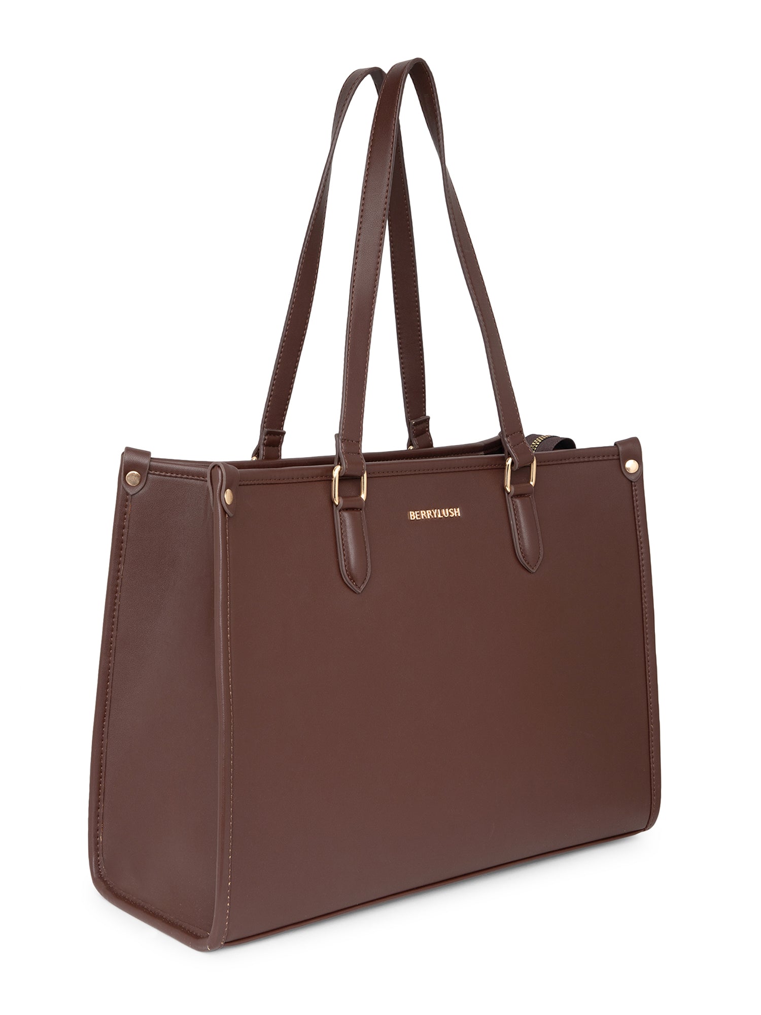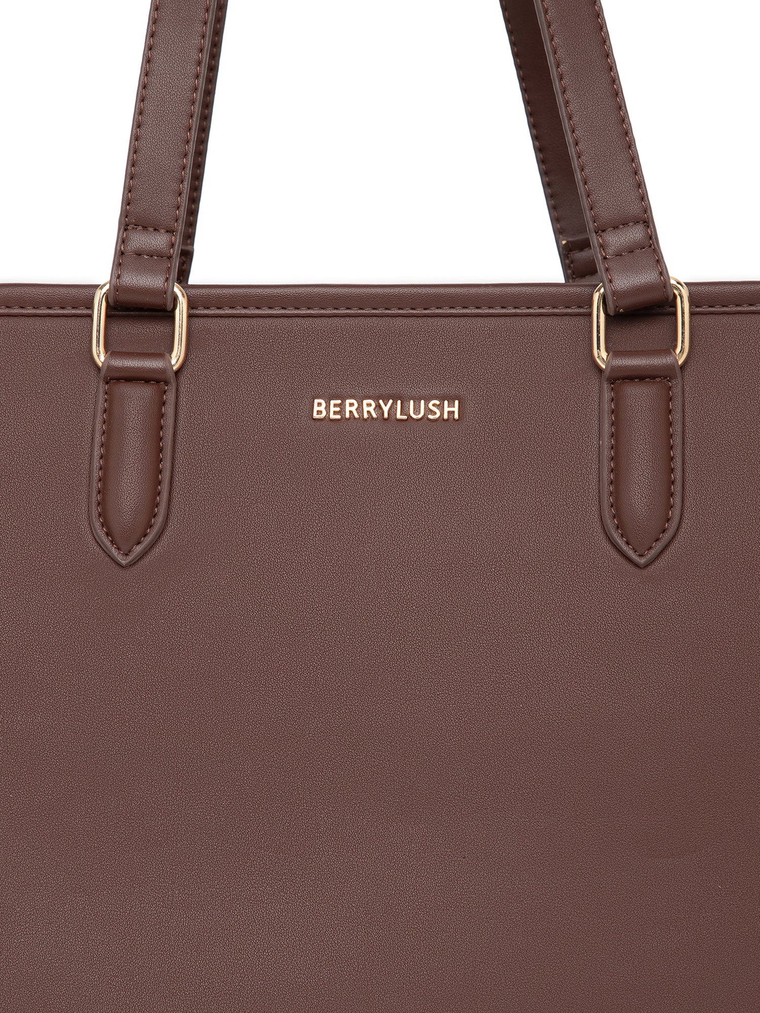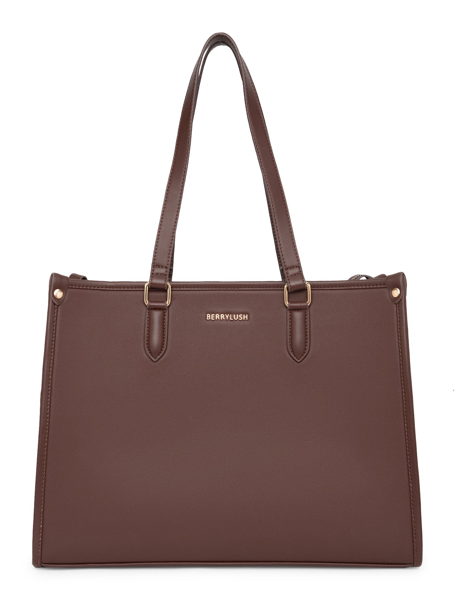 Berrylush Women Solid Brown Synthetic Leather Two-Handles Zipper-Up Embellished Tote Bag