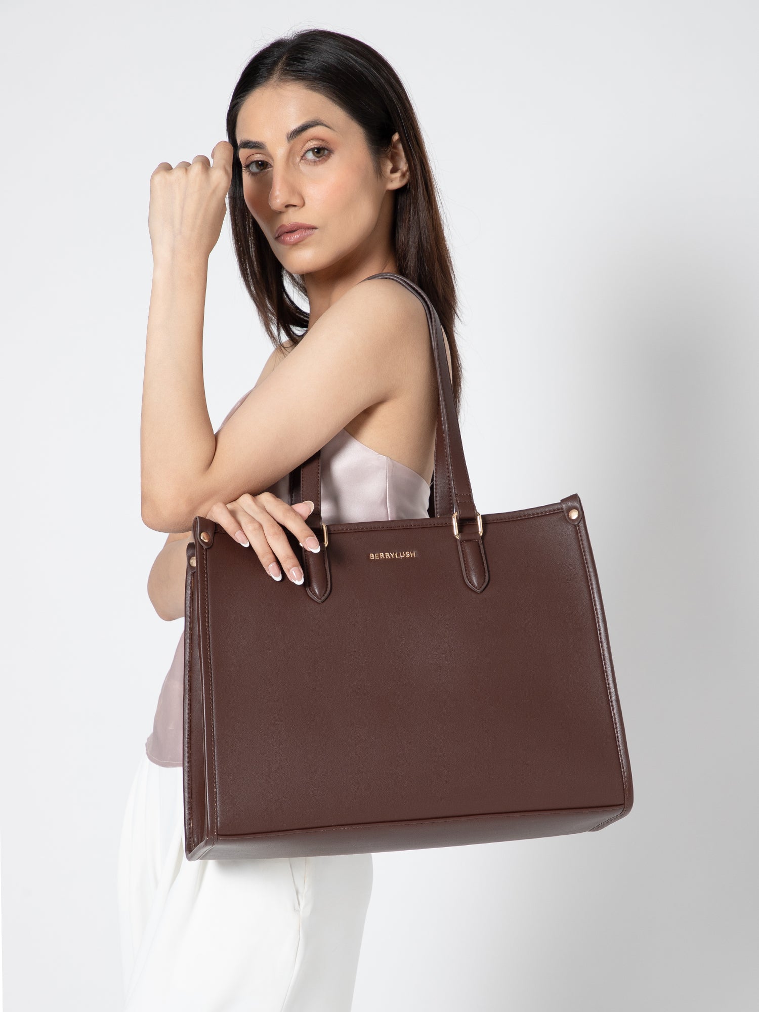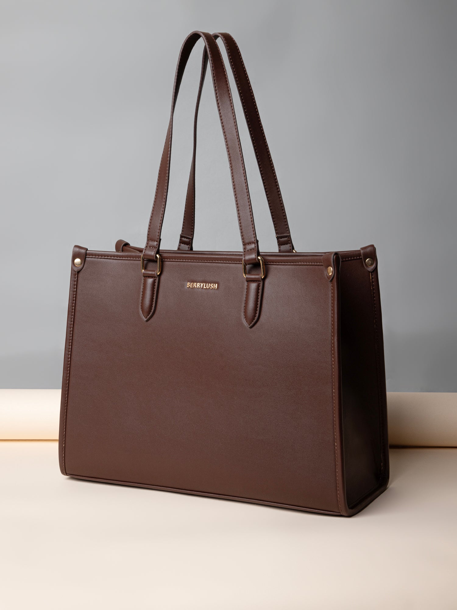 Carry your essentials in style with the Berrylush Solid Brown Synthetic Leather Two-Handle Zipper-Up Embellished Tote Bag. This chic and practical tote features a spacious main compartment with a secure zipper closure, perfect for carrying your everyday essentials. The embellished surface adds a touch of elegance, making it an ideal choice for casual outings. With two handles for comfortable carrying, one inner pocket for organization, two mobile pouches for easy access to your phone and other essentials, and two zippers for added security, this tote bag is both stylish and functional.