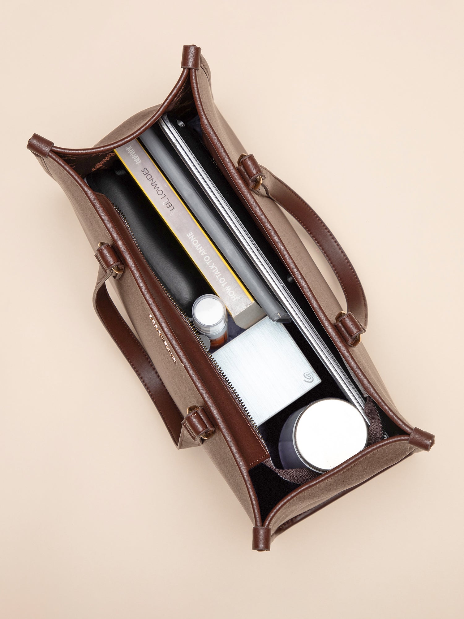 - Brown shade and a solid pattern give this tote bag a chic and trendy look