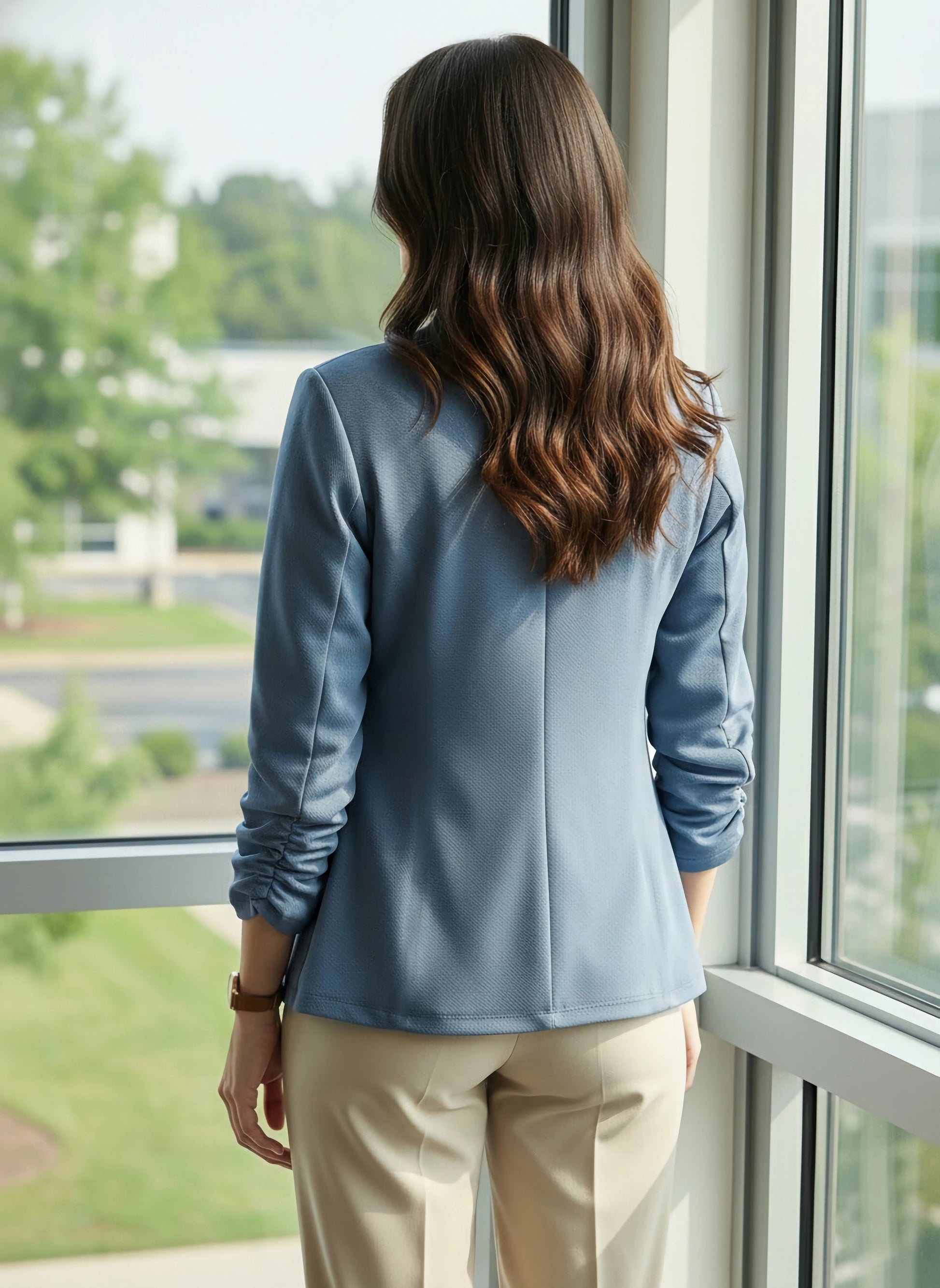 Berrylush BIZwear Women Solid Blue Shawl Collar Neck Ruched Cuff Single Button Tailored Regular Blazer