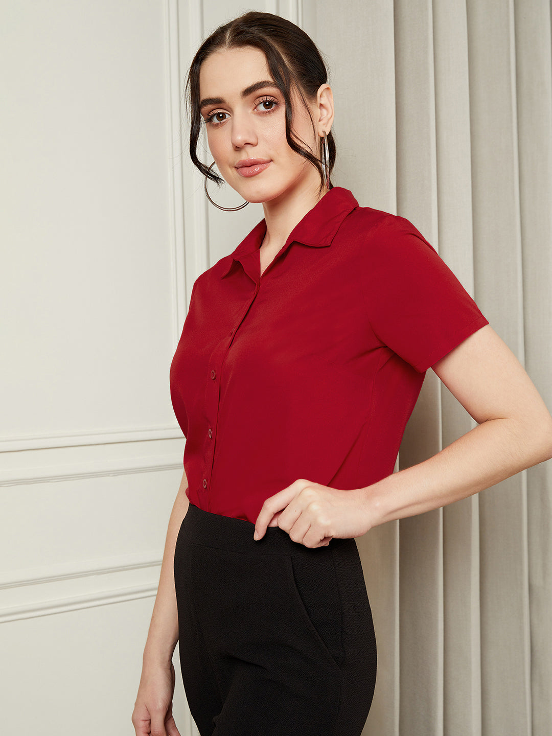Berrylush BIZwear Women Solid Red Spread Collar Neck Front Button Curved Hem Regular Shirt