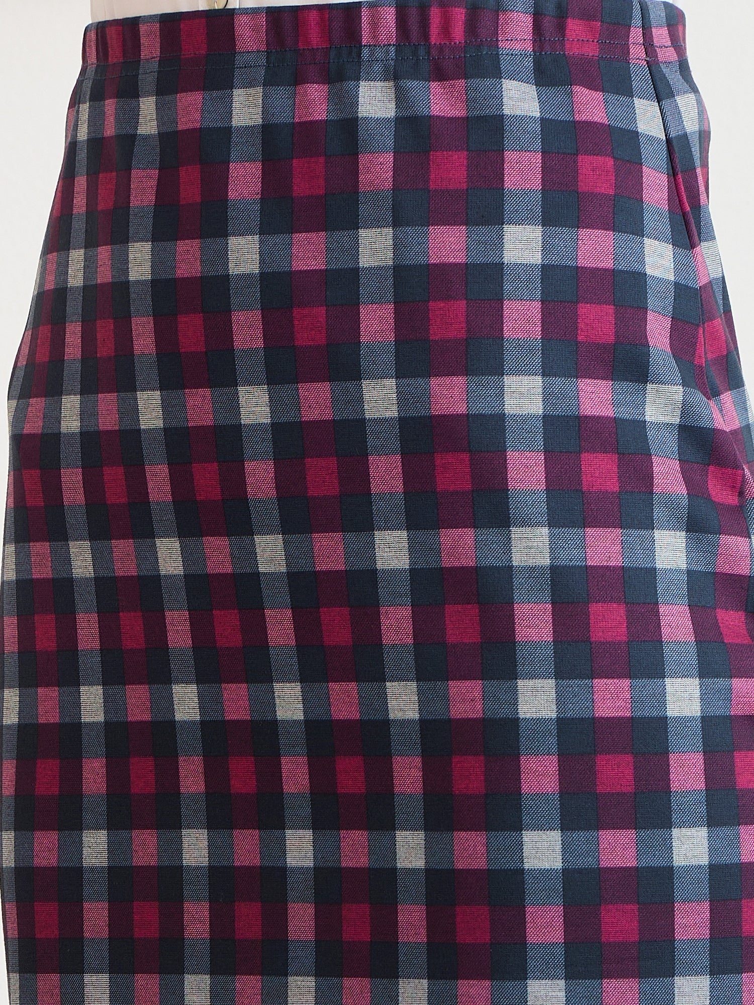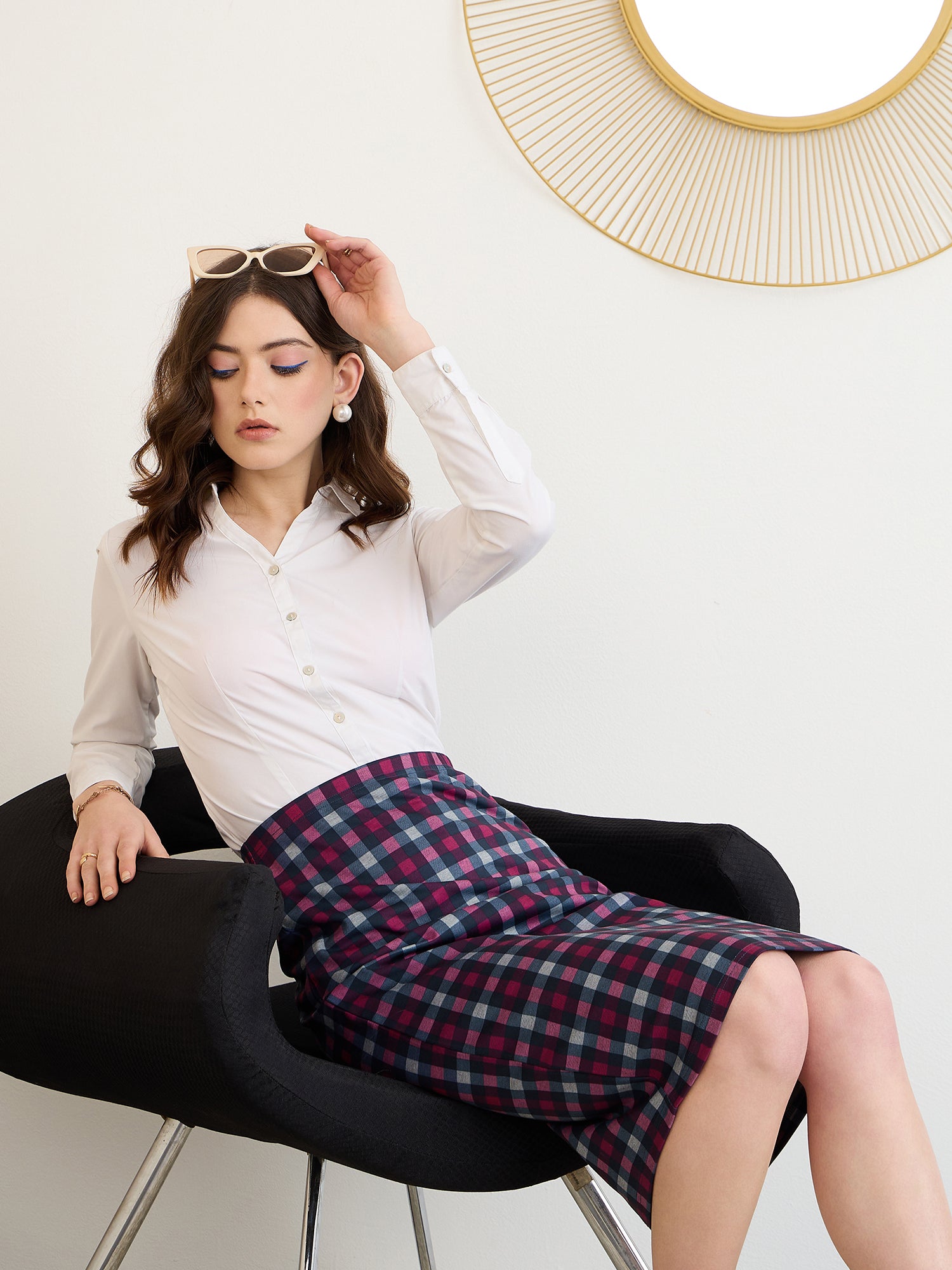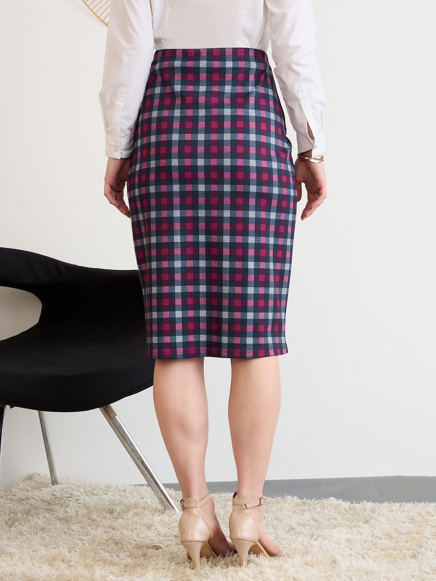 Elevate your office wardrobe with the Berrylush BIZwear Multicolour Checked Print Pencil Midi Skirt. Designed for the modern professional, this high-rise waist skirt features a vibrant checked print that exudes confidence and style. The slip-on design ensures ease of wear while its knitted polyester fabric offers both comfort and a flattering fit. Perfect for formal settings, its straight hemline and opaque weave maintain a sleek, polished look all day long. Step into your next meeting with sophistication and flair in this exquisite midi-length piece.