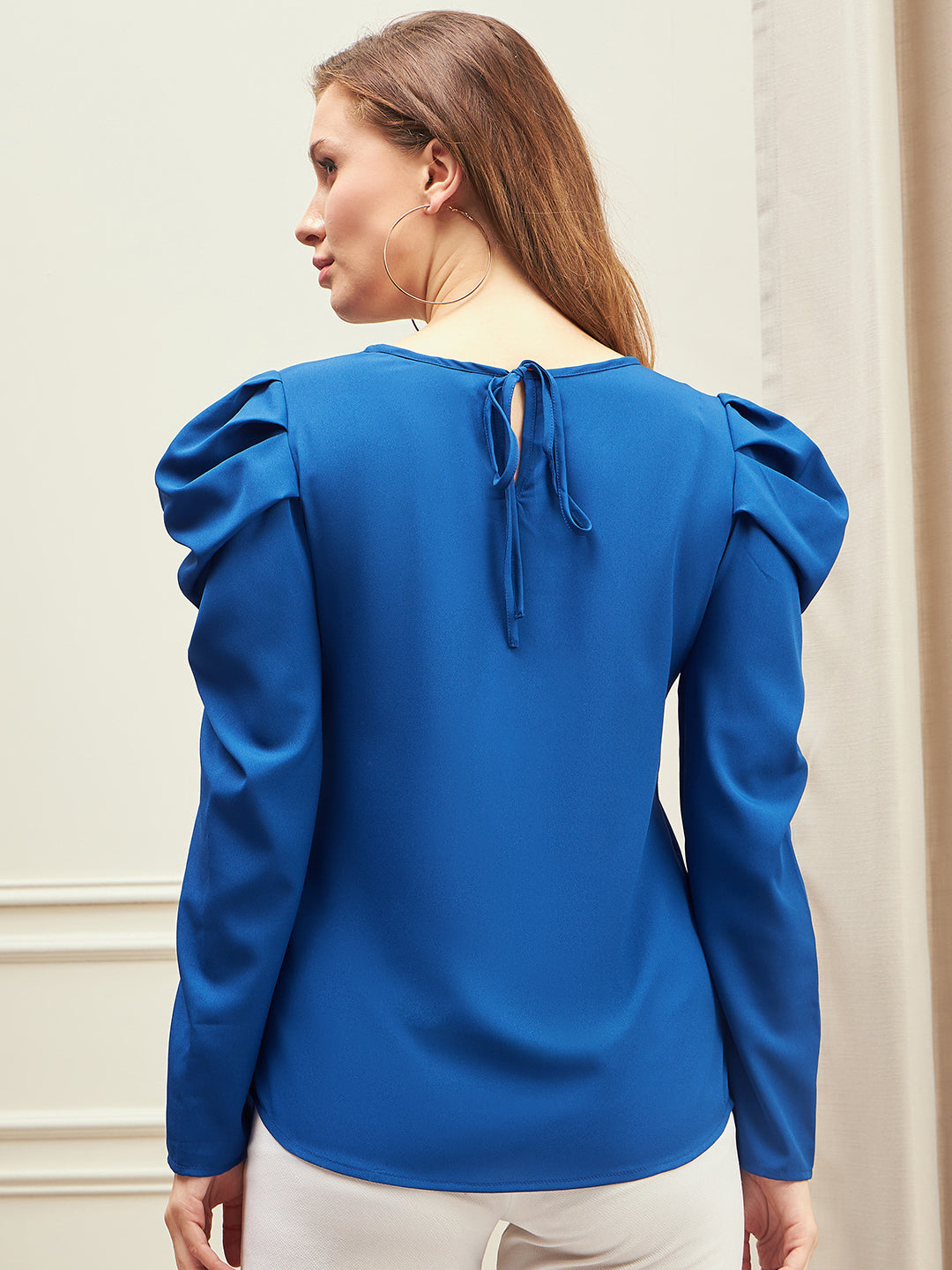 Berrylush BIZwear Women Solid Blue Round Neck Puff Sleeves Pleated Regular Top