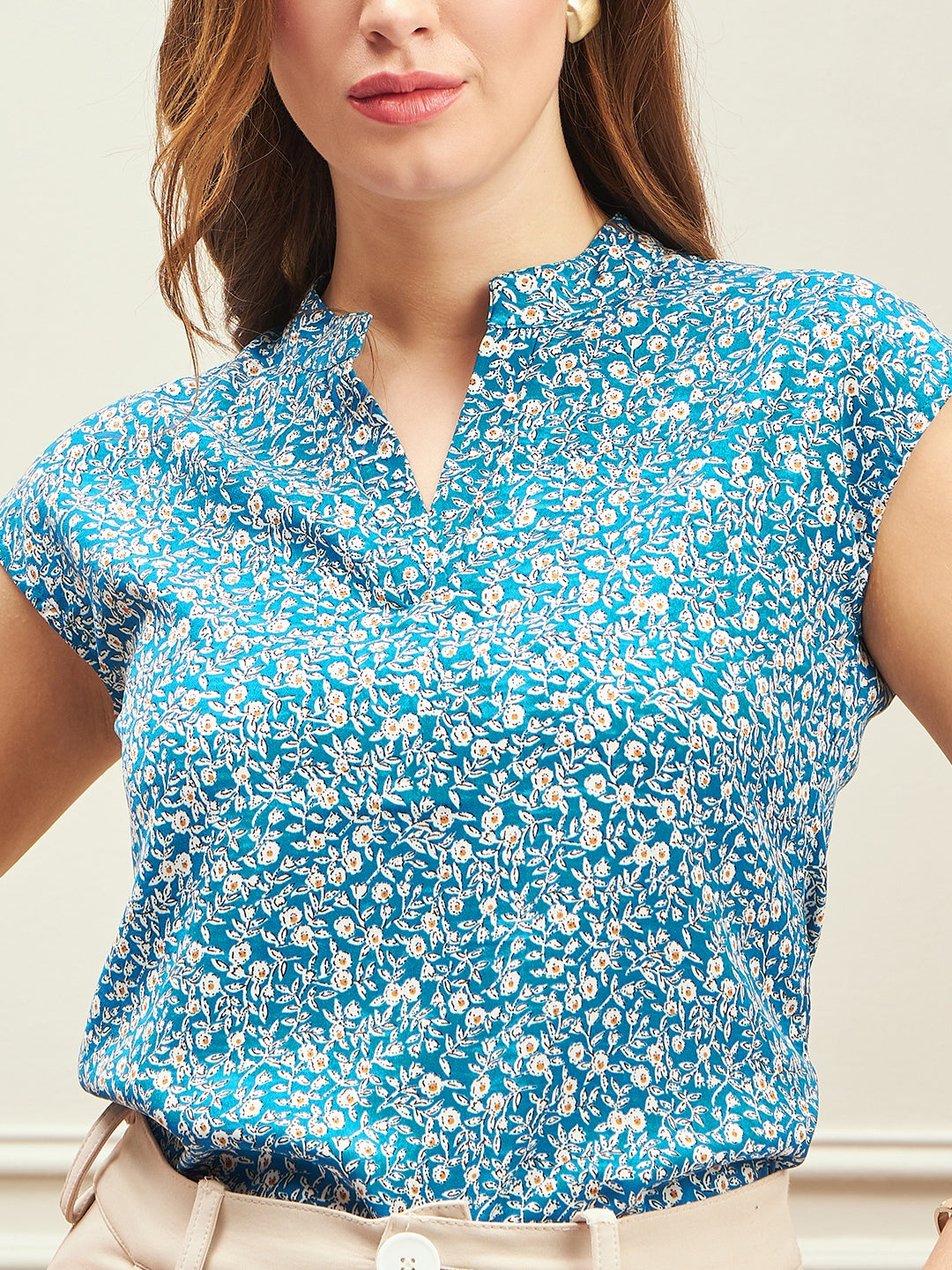 Elevate your office wardrobe with the Berrylush BIZwear Floral Printed Mandarin Collar Neck Top. Crafted in a crisp blue and white floral pattern, this top showcases a sophisticated mandarin collar and stylish extended sleeveless design, perfect for formal settings. The regular fit and woven polyester fabric provide both comfort and durability throughout the day. Its opaque material ensures professionalism in every setting, making it an ideal choice for those important meetings or business lunches. Step into your next professional challenge with confidence and style!