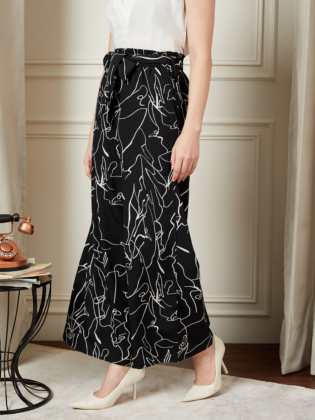 Berrylush BIZwear Women Black & White Abstract Printed Tie-Up Waist Slip-On Regular Parallel Trousers