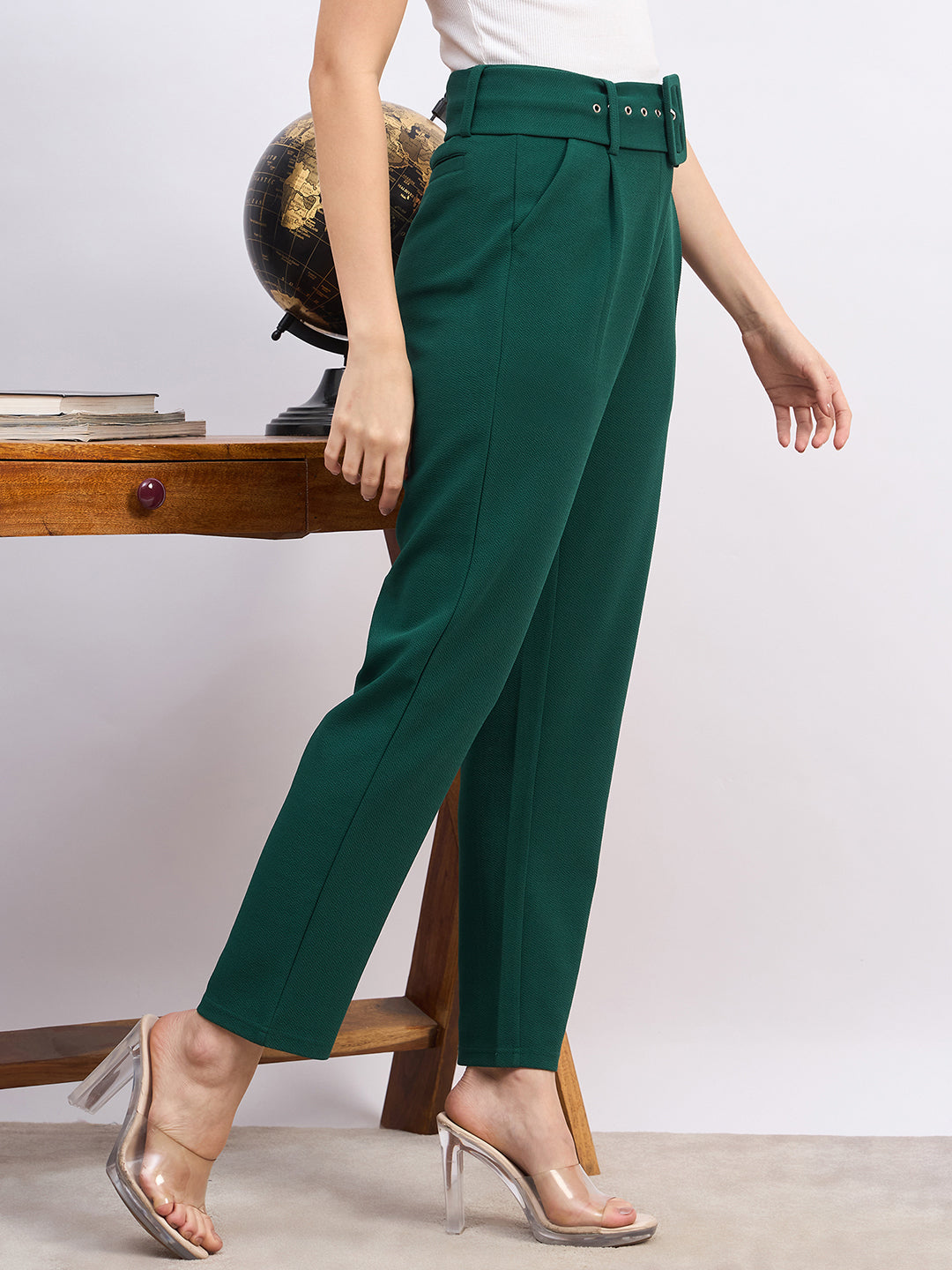 Berrylush BIZwear Women Solid Green High-Rise Belted Waist Four-Pockets Pleated Maxi Trousers