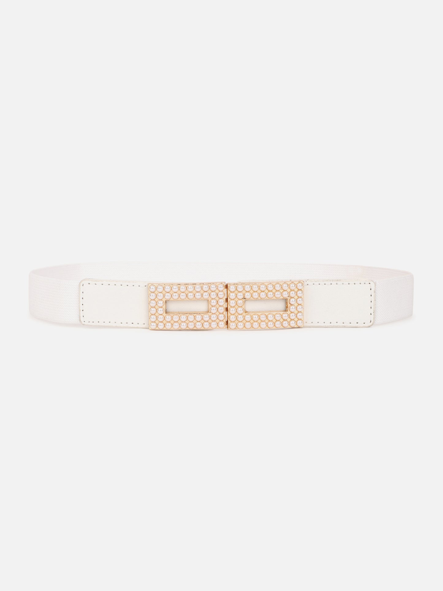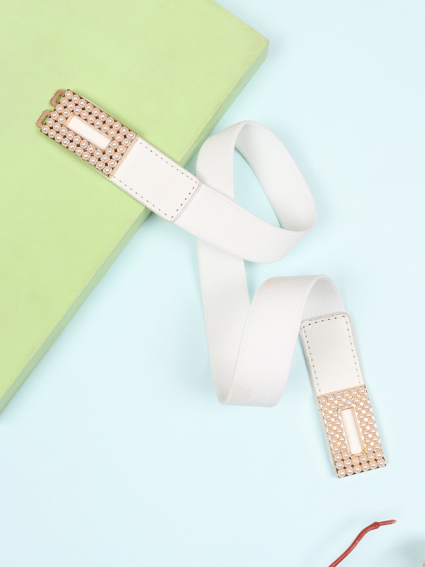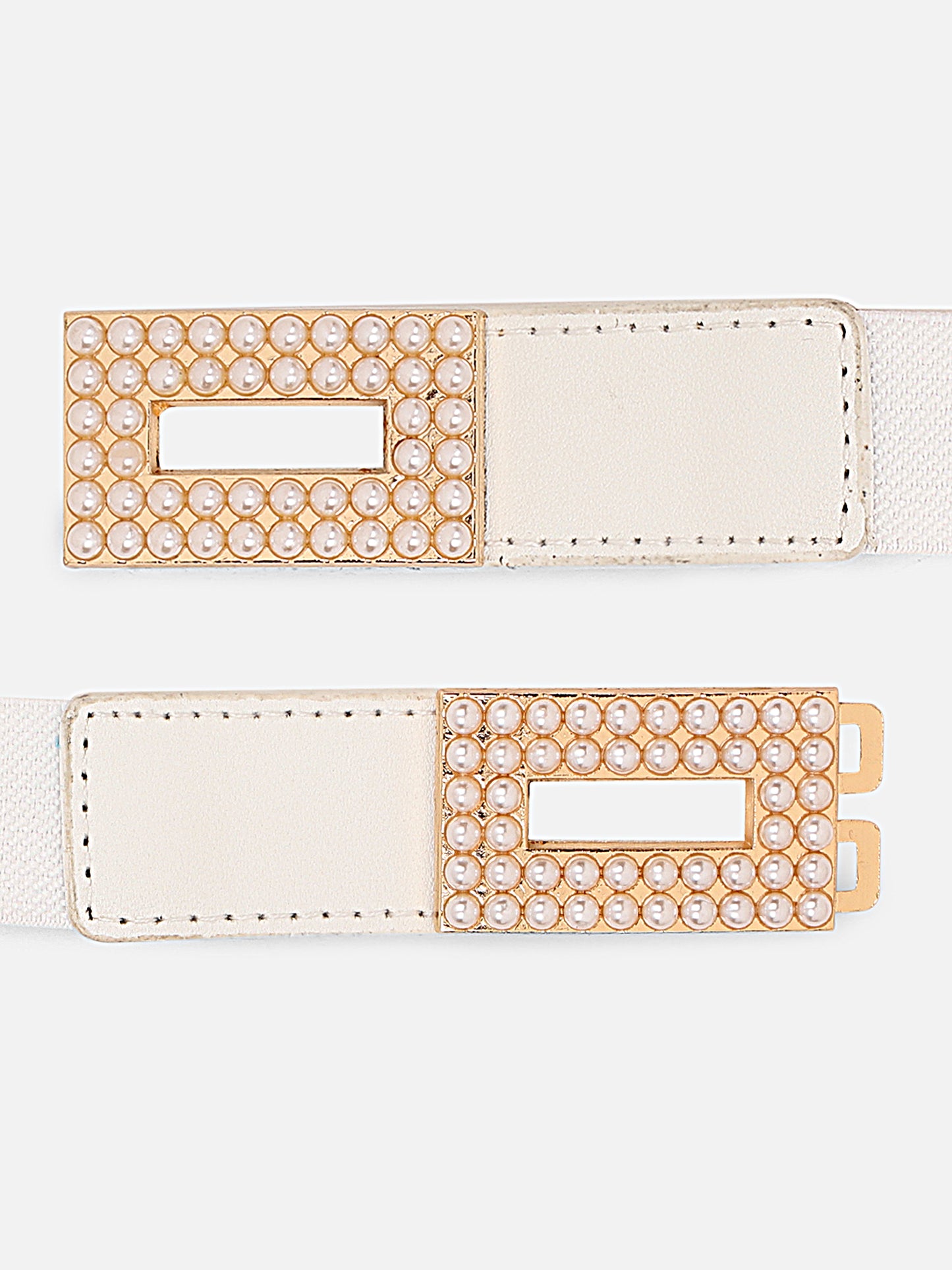 Berrylush Women Solid White Golden Embellished Pearl Studded PU Nylon Interlock Regular Slim Belt
