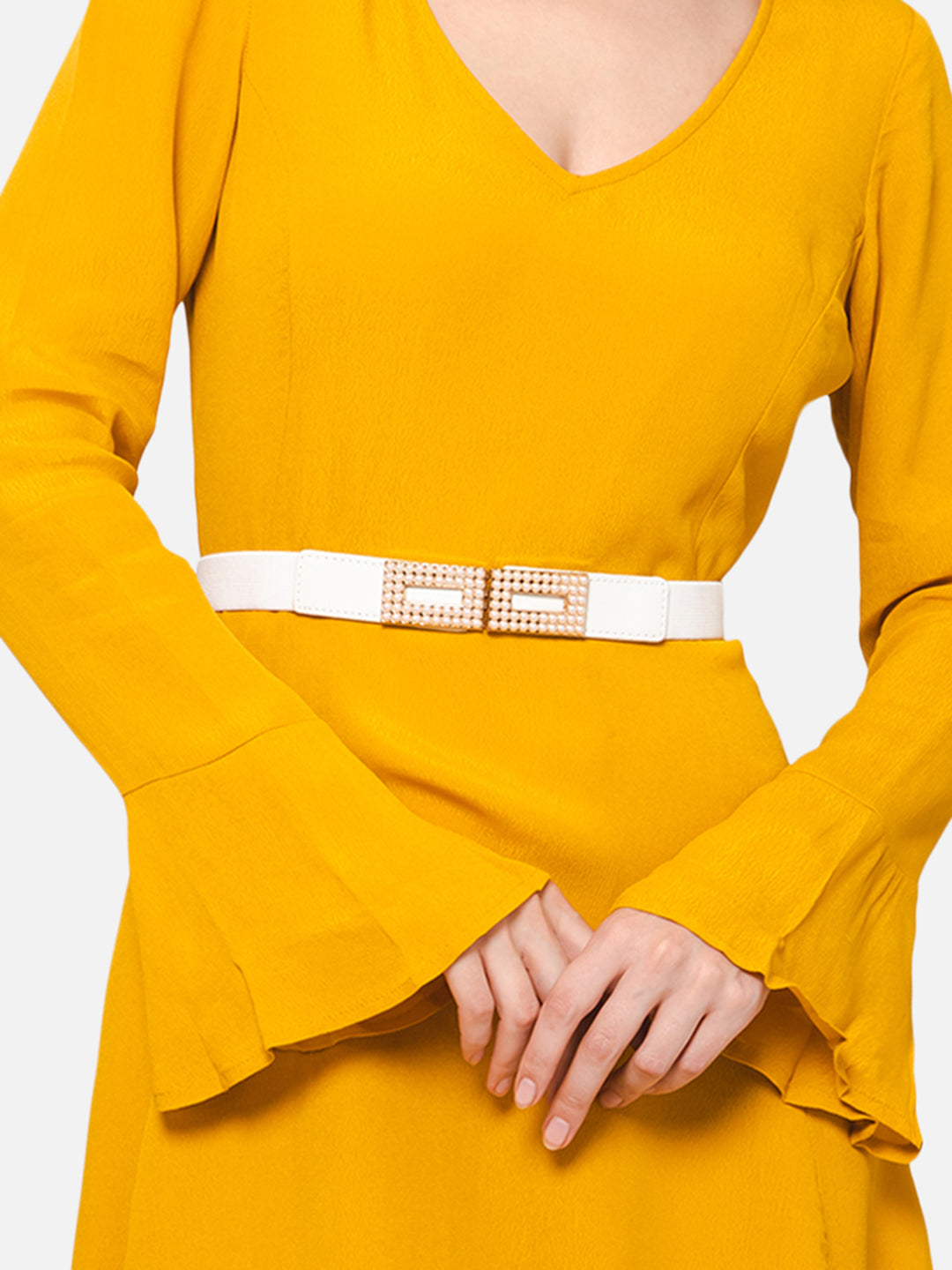 Redefine your casual wardrobe with glamour and a whole new definition of style by selecting this adorable Solid White Golden Embellished Pearl Studded Regular Belt from Berrylush. Showcasing white shade that gives this belt a classy and clean appeal with a touch of sophistication while giving away a pleasing vibe. Fashioned with slim width that lends this belt a smart and chic appearance with effortless styling features for any outfit. Moreover, the pearl studded design adjoins stunning charm to this belt with cute detailing. Look fabulous on your next dinner date by pairing this belt over your red dress along with white high-heels.