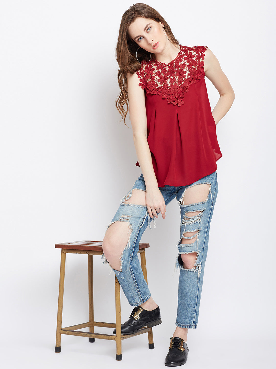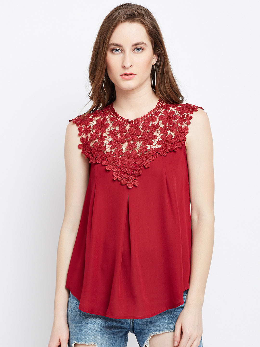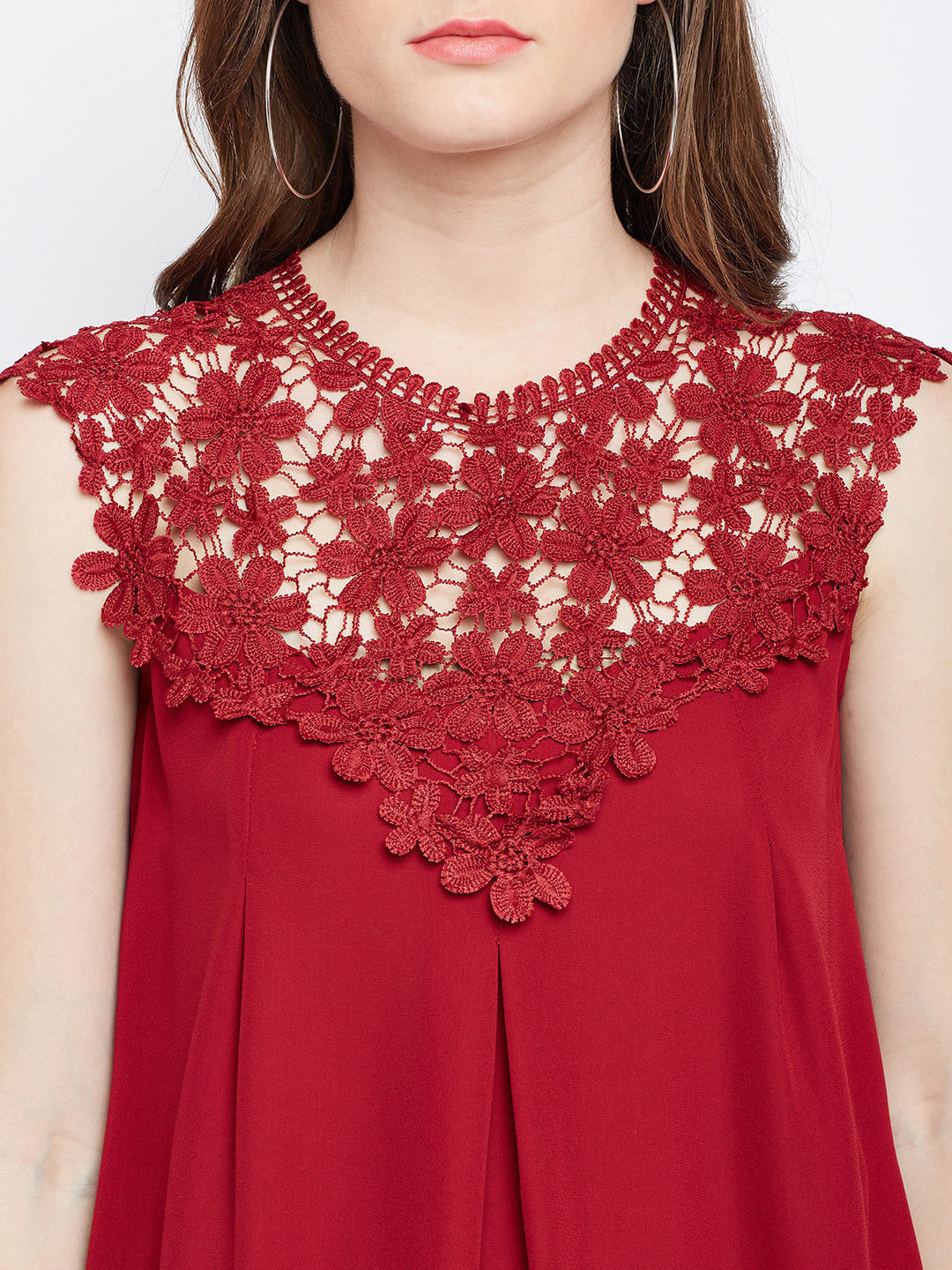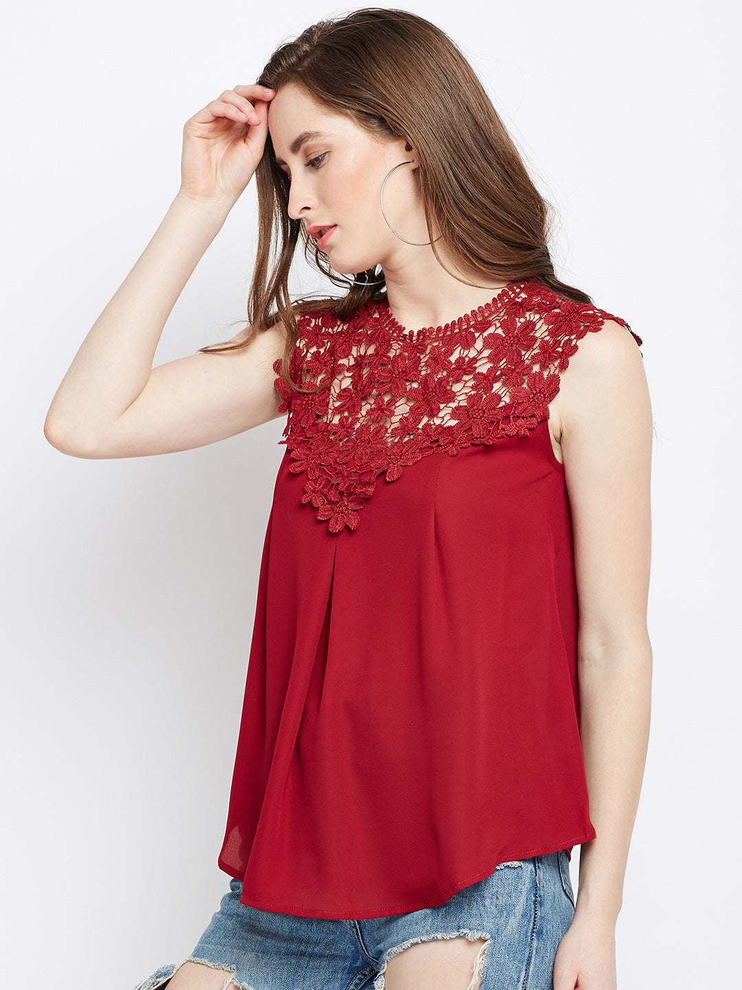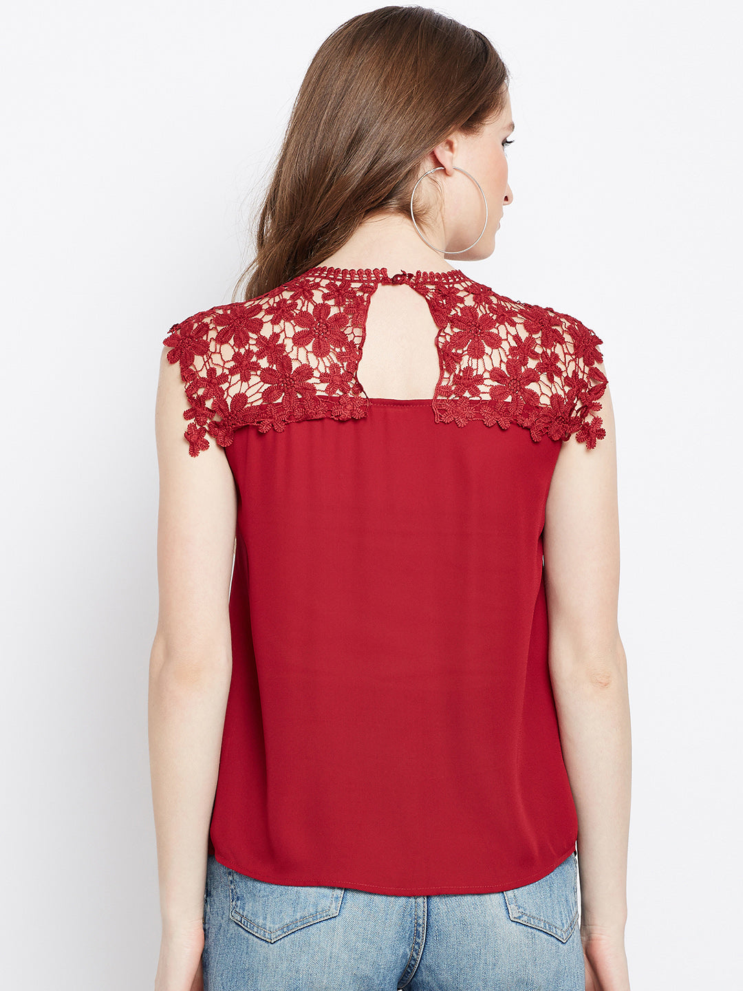 Restyle your casual closet with an alluring and bold ascent by adding this mesmerizing Solid Maroon Round Neck Laced Regular Top designed by Berrylush. This top enables you to grab all the attention at casual events as the amusing lace design over the neck and shoulders gives an eccentric appeal to your upper body portion. Designed with a round neck to add cinematic charm to the top while the maroon shade complemented with a solid pattern presents a unique and fashion-ahead appearance. To get an astonishing look you can pair up this beautiful self-deign top with a pair of ripped jeans, hoop earrings, and high-heels.