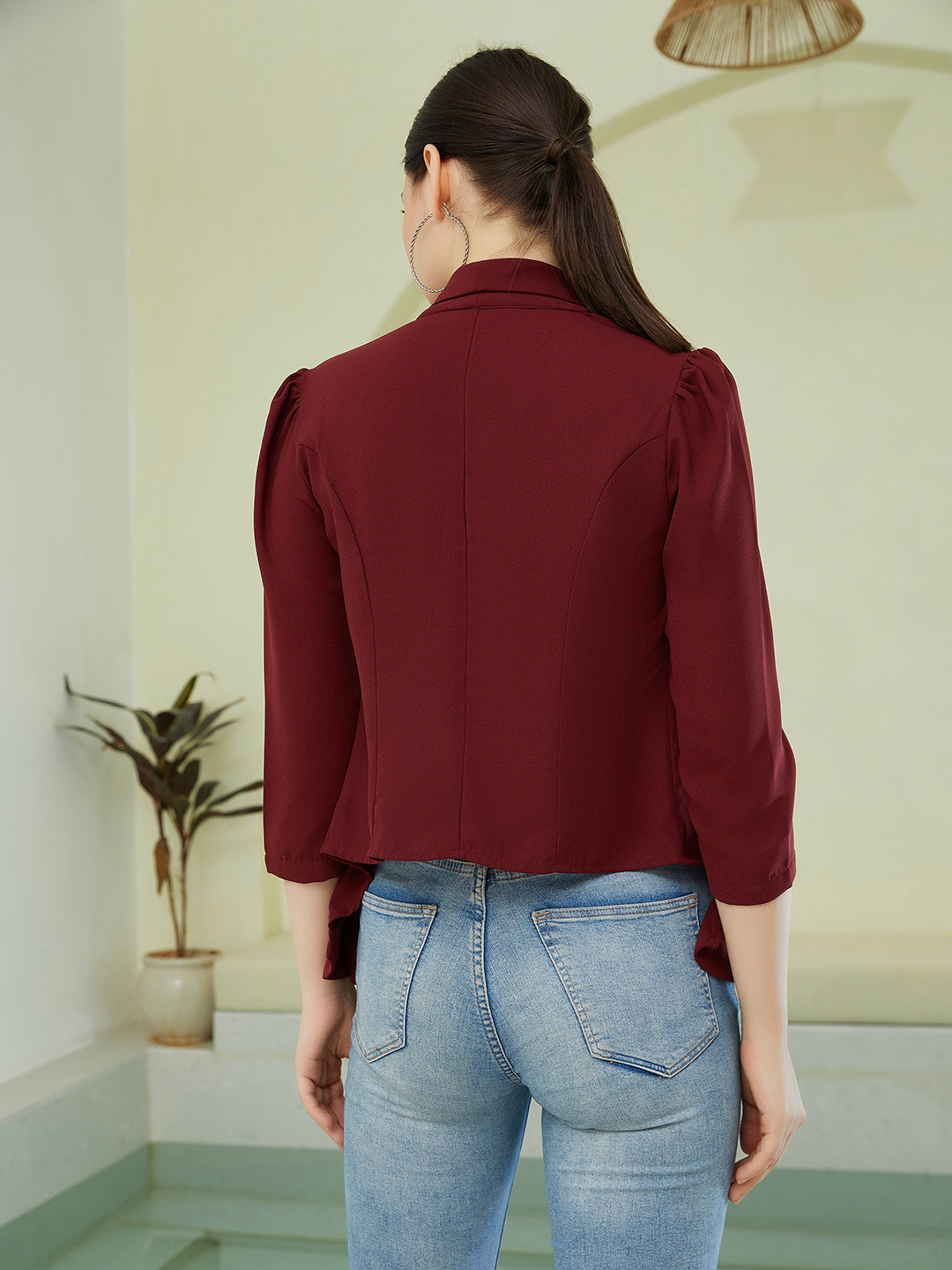 Bring in monotone madness and casual style within your capsule closet with this classy Solid Maroon Shawl Collar Neck Long Sleeves Open-Front Regular Blazer from Berrylush. Highlighting a maroon solid pattern that gives this blazer an eye-catching design with a monochromatic vibe. Showcasing shawl collar design that lends your neckline a formal fashion statement with unrestricted breathability. Also, the regular length assembles a versatile design of this blazer with chic appeal. Complete your look effortlessly by wearing this open-front blazer with a pair of black high-heels, silver hoop earrings, and a trendy black side bag.