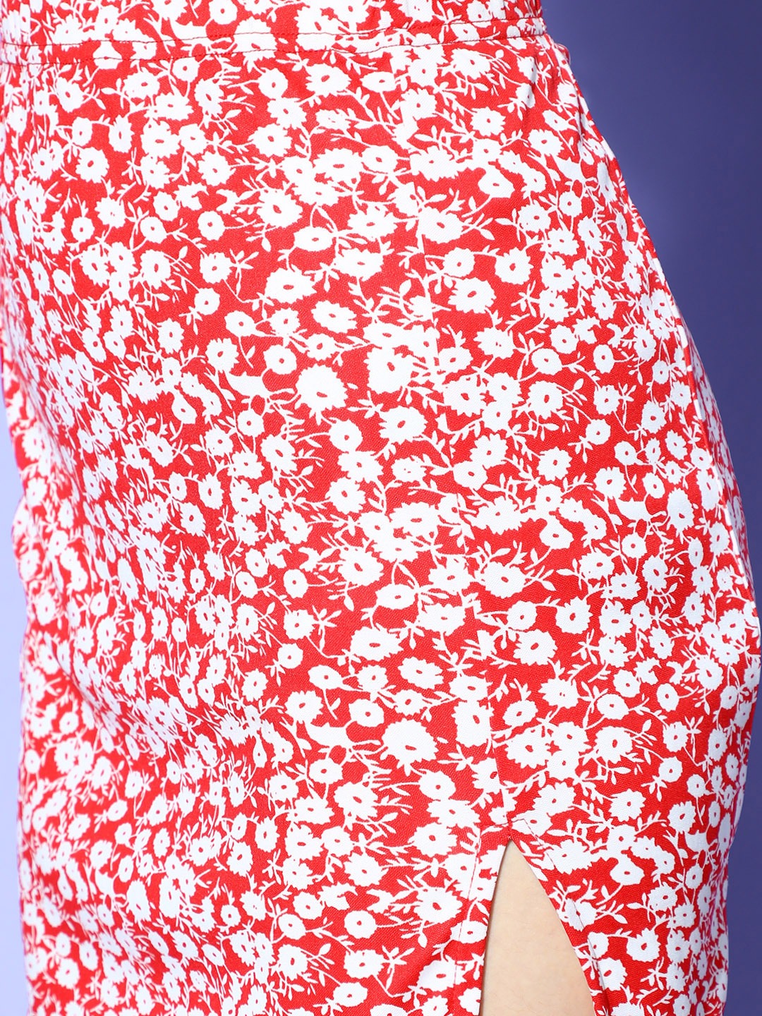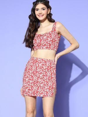 Berrylush Women Red & White Floral Printed Square Neck Crop Top and Mini Skirt Co-Ord Set