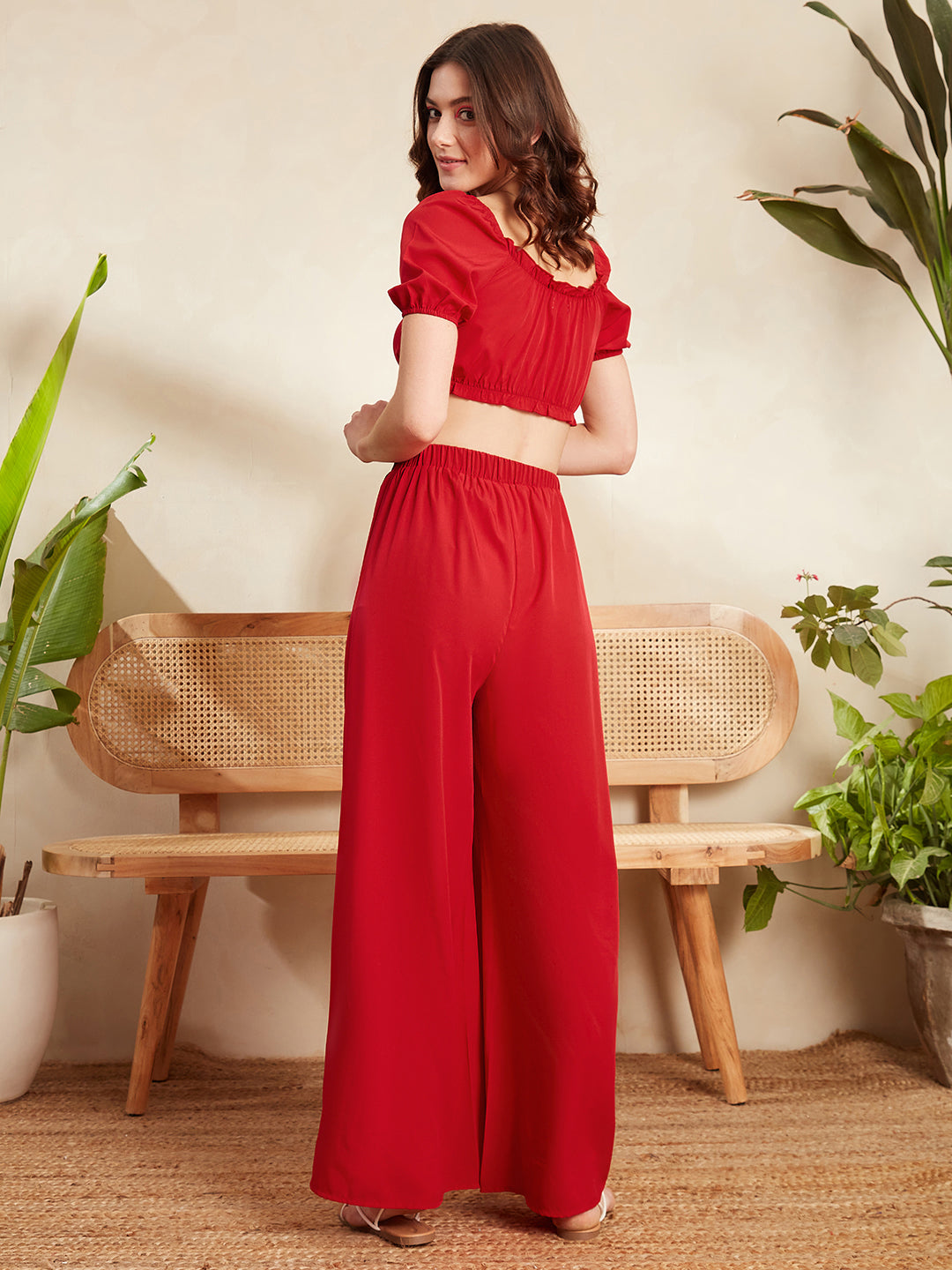 Introducing Berrylush's Solid Red V-Neck Front Tie-Up Frilled Crop Top & Wide-Leg Pants Co-Ord Set - the epitome of style and comfort. Crafted from breathable polyester, this vibrant red set is perfect for travel escapades. The crop top features a flattering V-neck, playful puff sleeves, and a chic tie-up closure that adds an extra dash of sass. Paired with slip-on wide-leg pants that graze the ankle, it offers an effortlessly stylish look. Finished with frilled detailing and woven to perfection for a straight hemline silhouette; opaque in transparency ensuring your confidence soars high! Turn heads as you stride in this solid pattern ensemble by Berrylush.