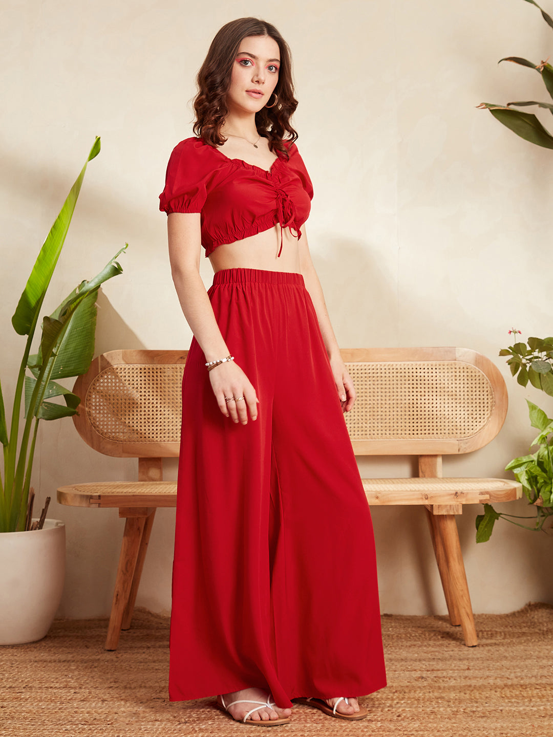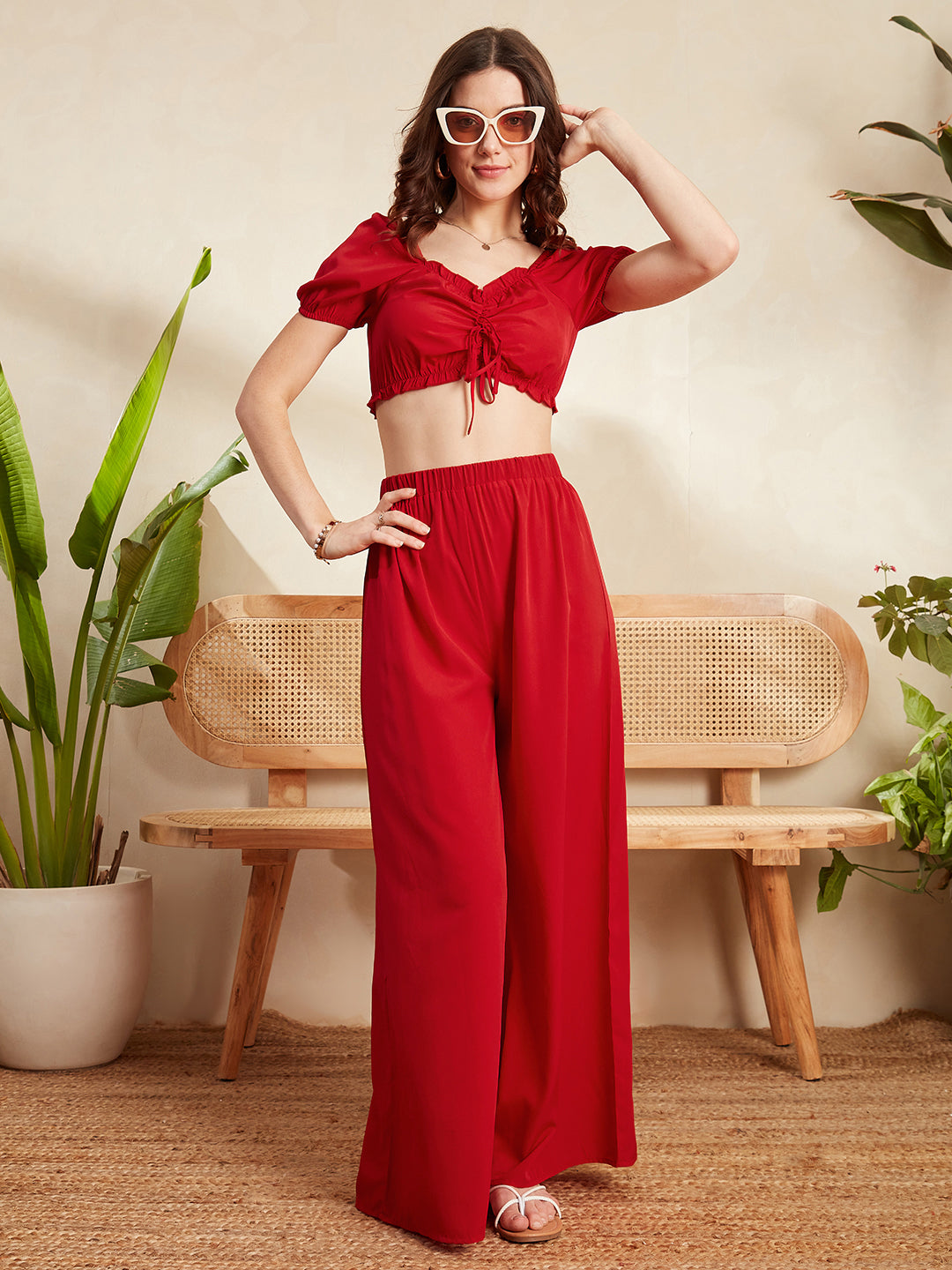 Berrylush Women Solid Red V-Neck Front Tie-Up Frilled Crop Top & Wide-Leg Pants Co-Ord Set