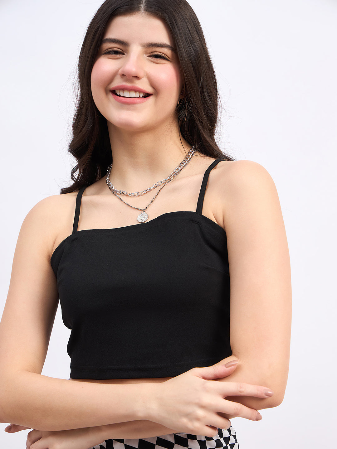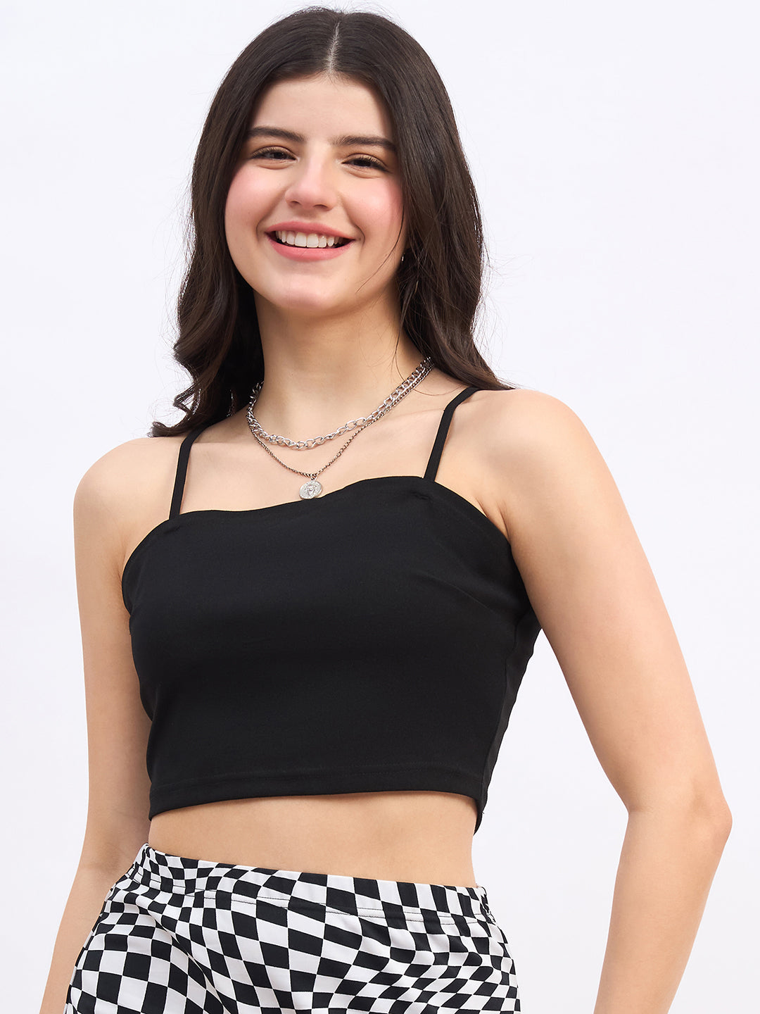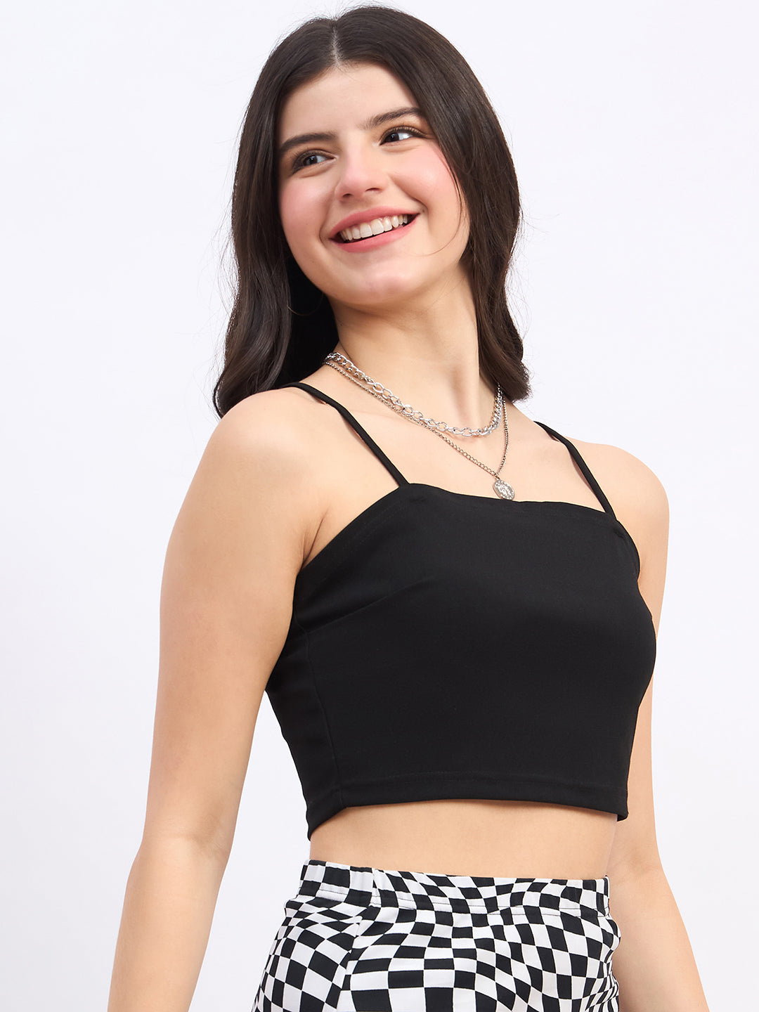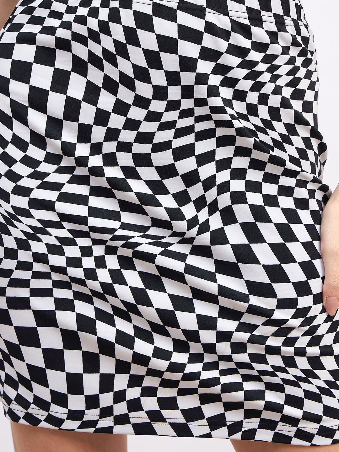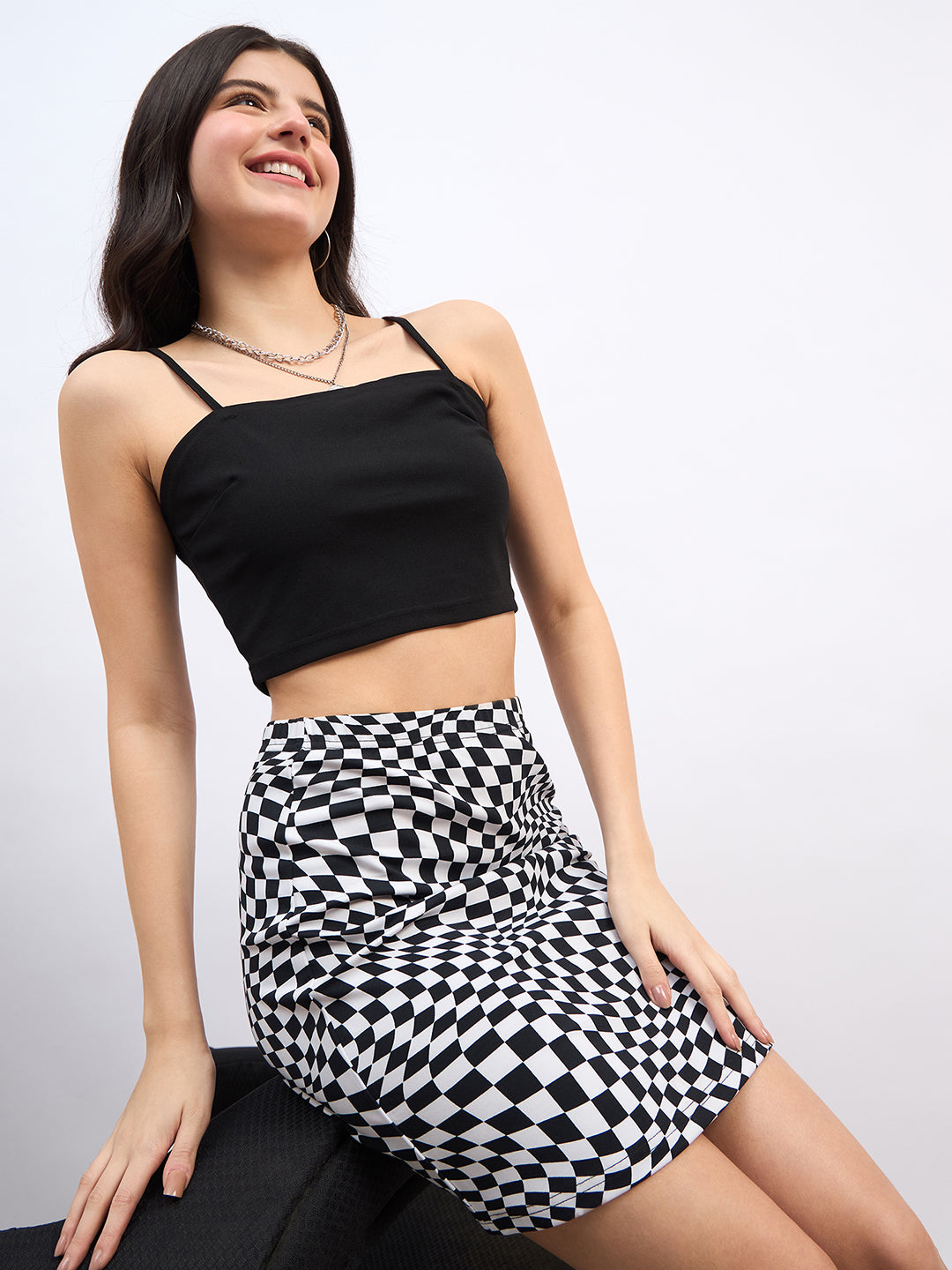 Berrylush Women Solid Black Square Neck Sleeveless Cropped Top & Black & White Checked Print High-Rise Waist Bodycon Mini Skirt Co-Ord Set