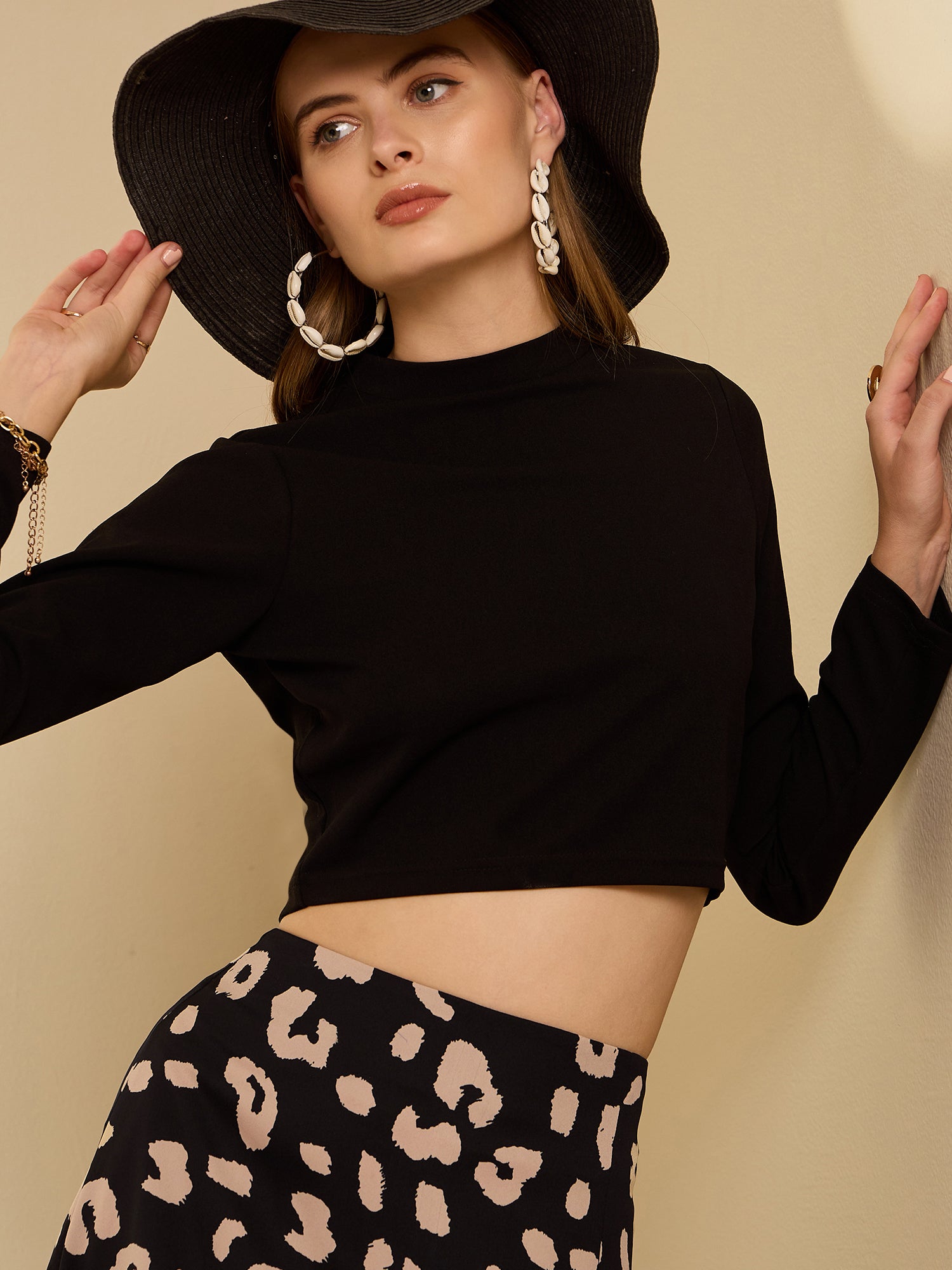 Step out in style with the captivating Berrylush Solid Black Crop Top & Black & Beige Animal Print Midi Skirt Co-Ord Set that promises to elevate your casual wardrobe. This ensemble features a chic, solid black high-neck crop top paired perfectly with a stunning midi skirt boasting an eye-catching black and beige animal print. The thigh-high slit on the flared hemline adds a daring touch, perfect for making bold fashion statements. Comfortably designed in woven polyester, this set guarantees opacity while offering both longevity and ease of wear with its slip-on closure type. Ideal for creating memorable looks, it's time to embrace your wild side elegantly!