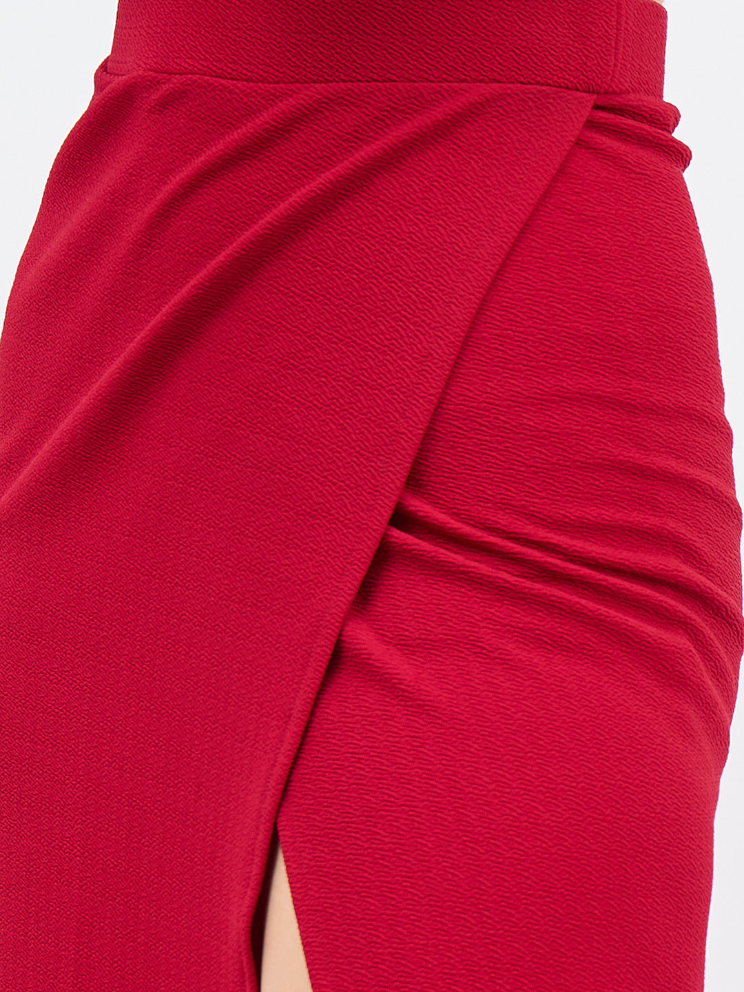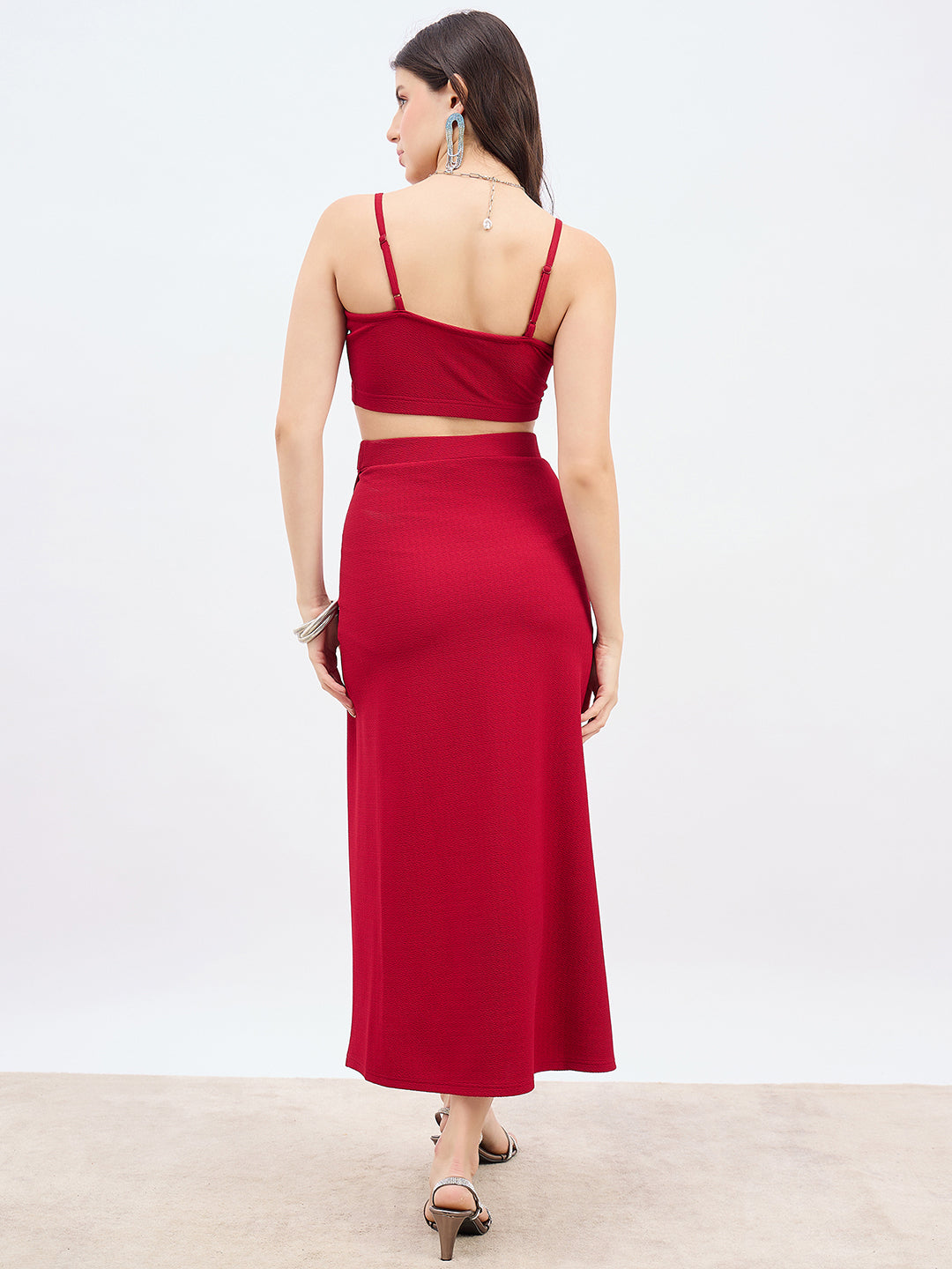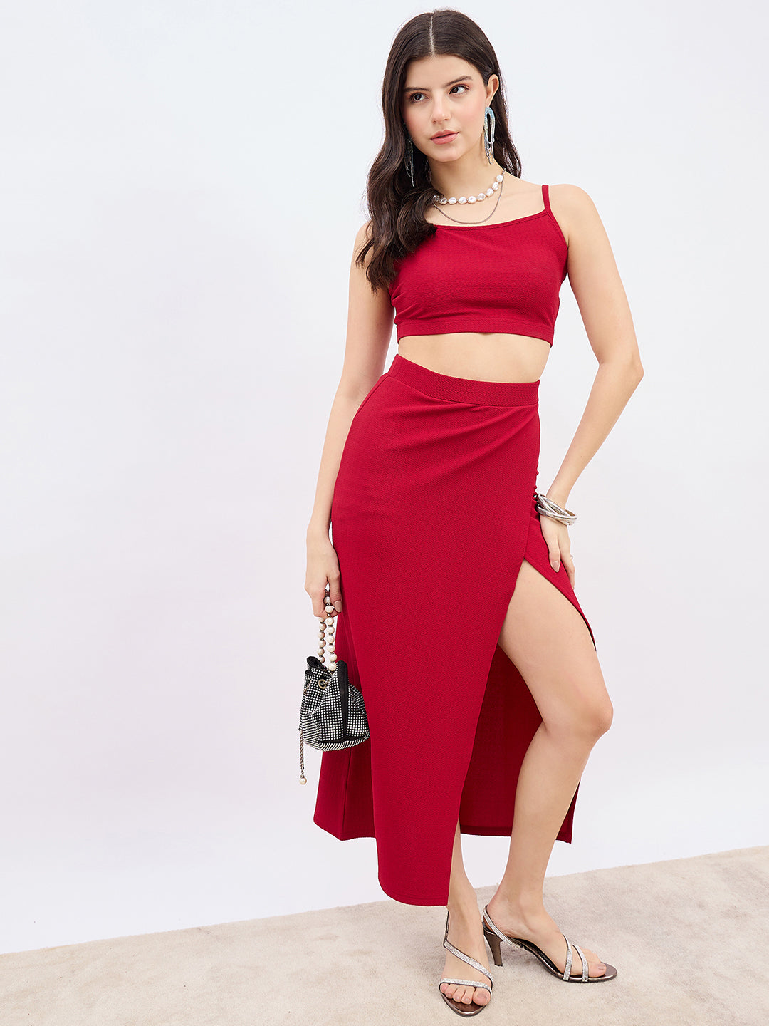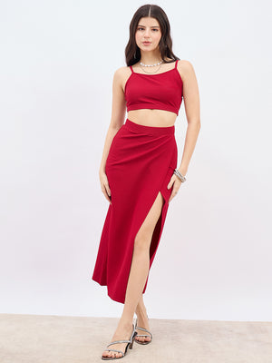 Berrylush Women Red Solid Shoulder Straps Crop Top With High Waist Split Thigh Skirt