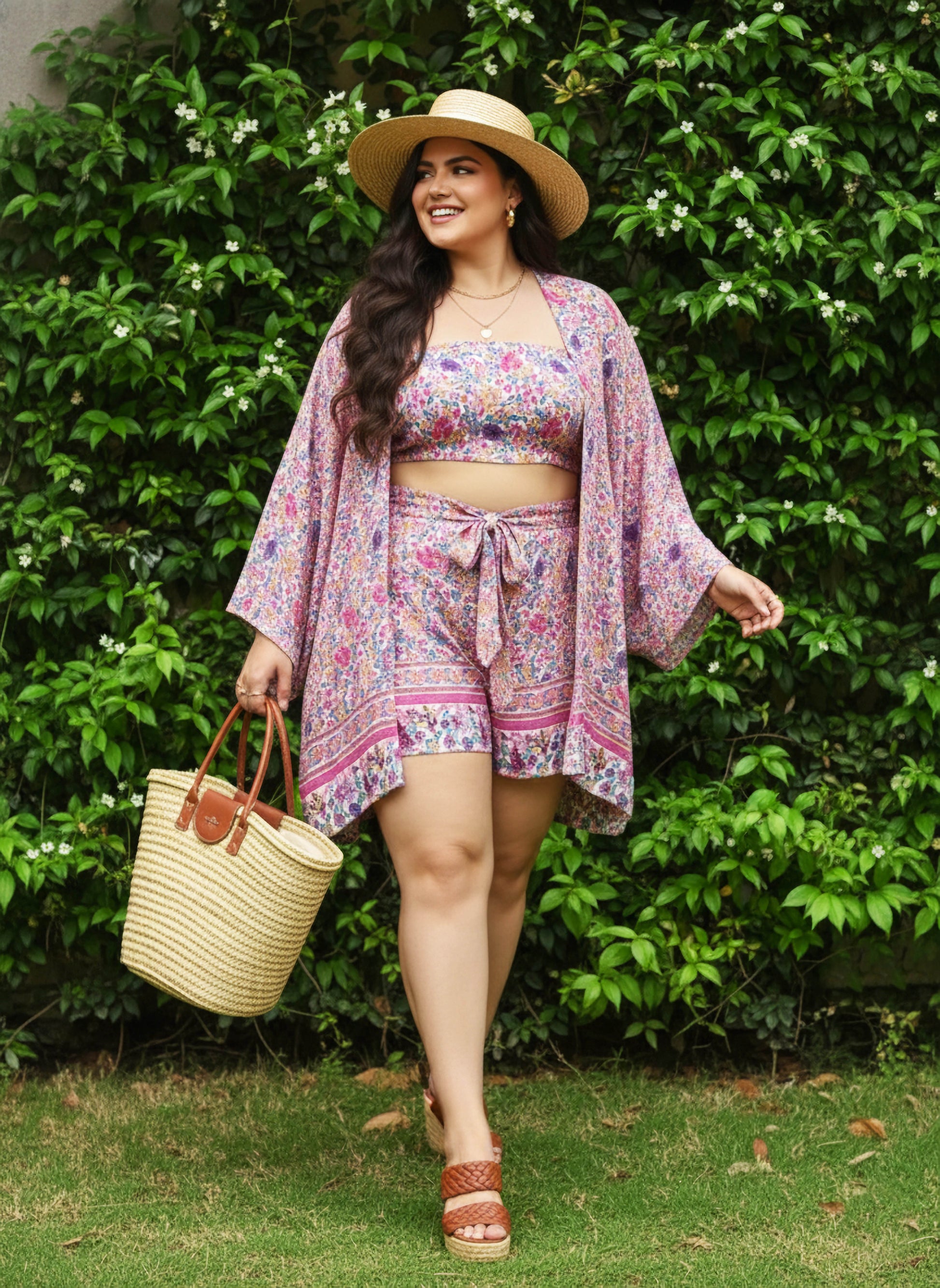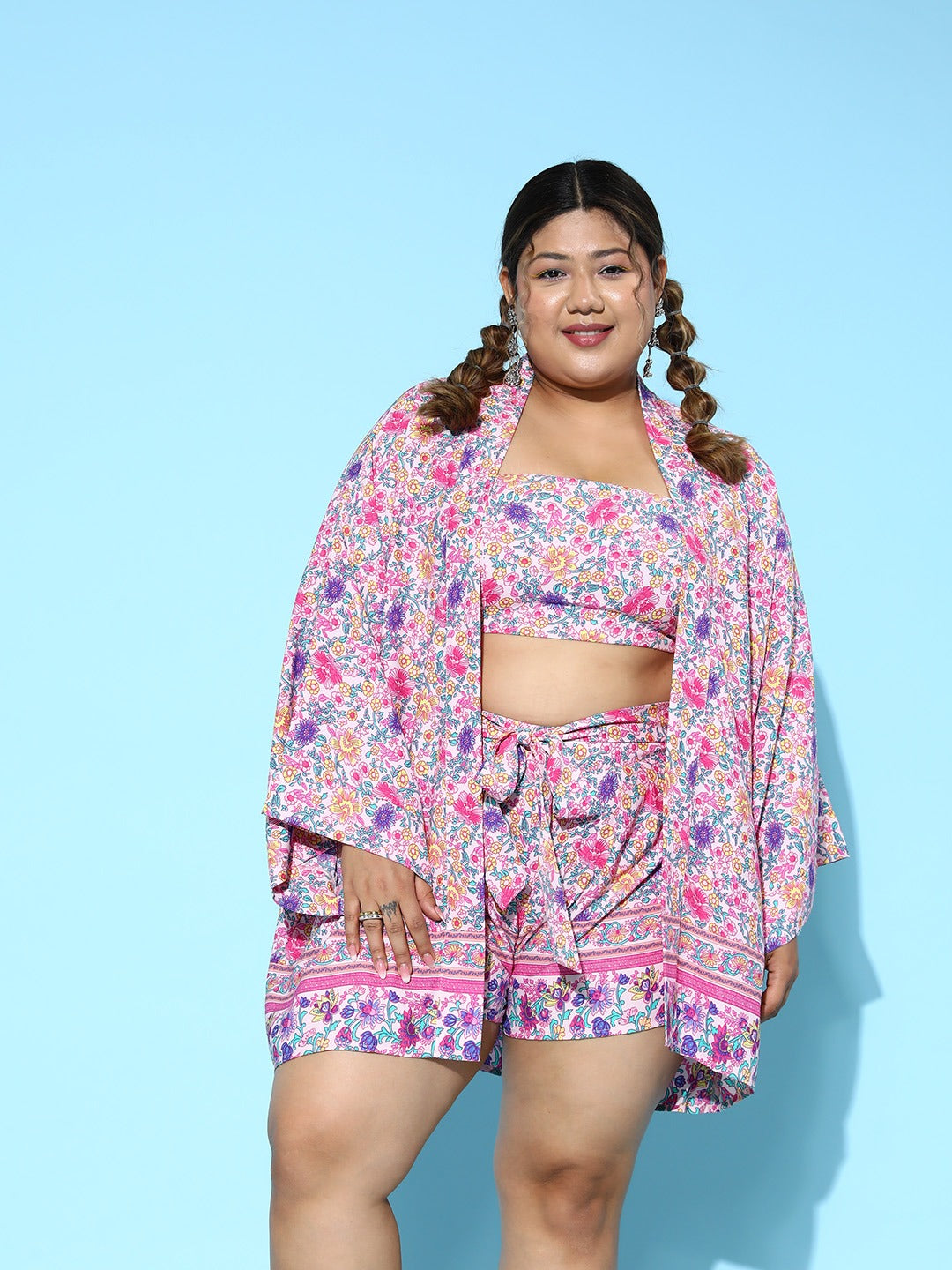 Berrylush Women Plus Size Pink & Purple Floral Printed Crop Top & Tie-Up Front Shorts With Kimono