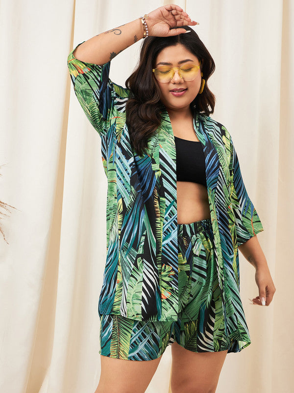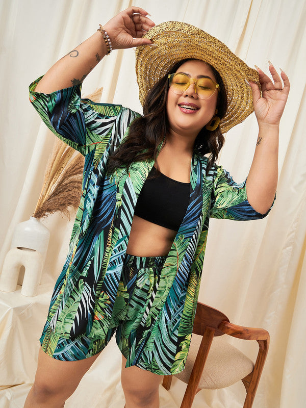 Berrylush Curve Women Green & Black Tropical Printed Open-Front Neck Shrug & High-Rise Mini Shorts Co-Ord Set