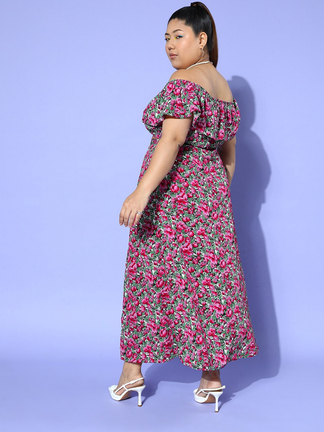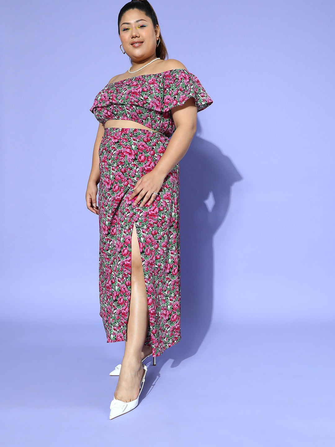 Berrylush Women Plus Size Purple & Green Floral Printed Off-Shoulder Neck Crop Top & Thigh-High Slit Maxi Skirt Co-Ord Set