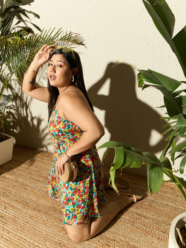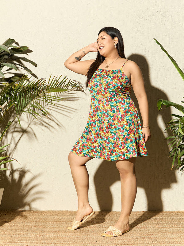 Berrylush Curve Women Red, Yellow, & Green Floral Printed Square Neck Sleeveless Crepe Fit & Flare Mini Dress