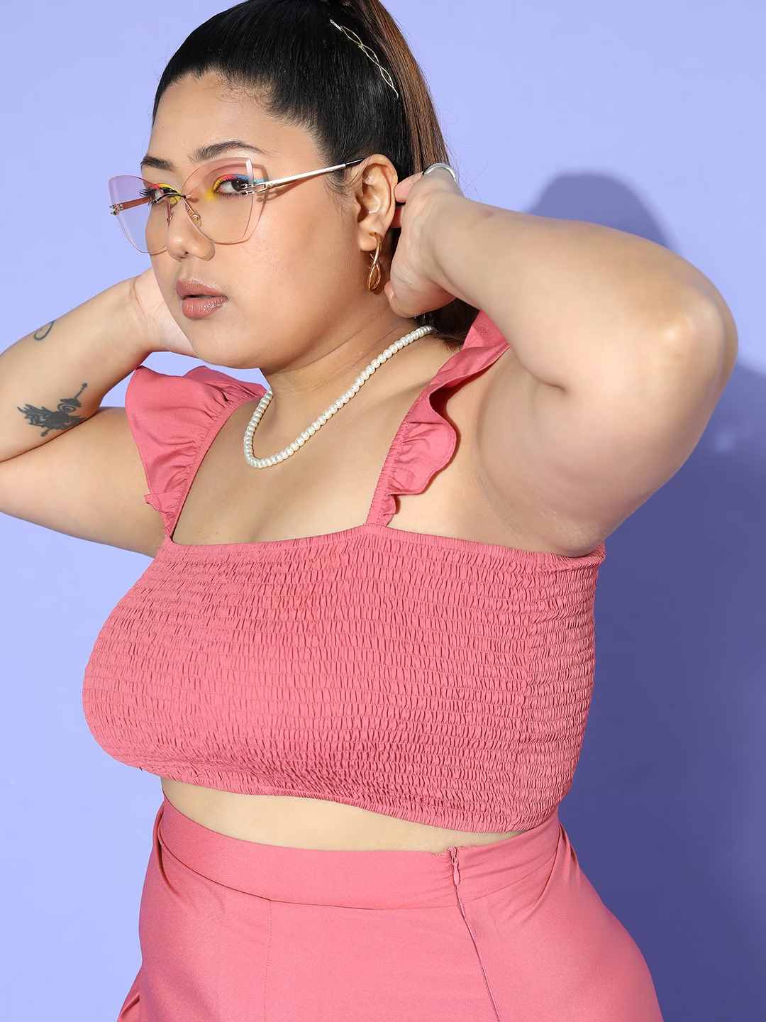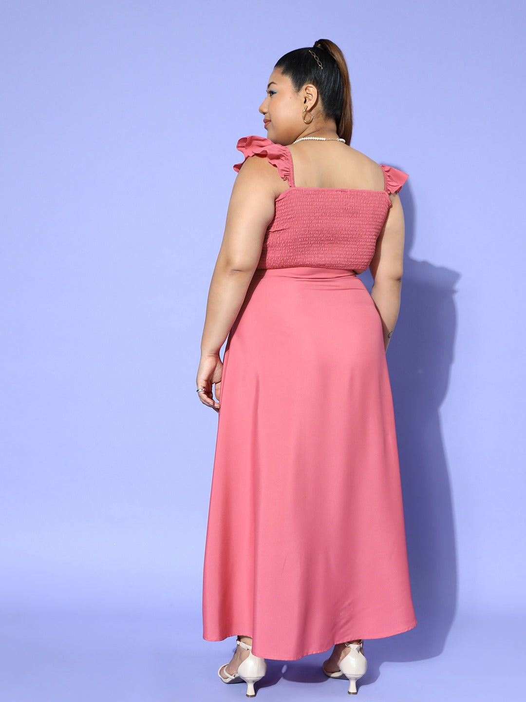 Berrylush Women Plus Size Solid Pink Square Neck Crepe Smocked Crop Top & Thigh-High Slit Maxi Skirt Co-Ord Set