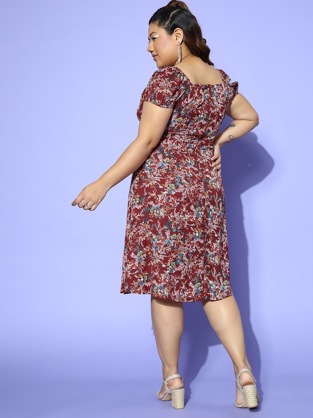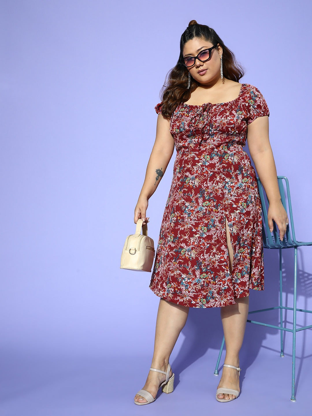 Berrylush Women Plus Size Maroon & Multicolour Floral Printed Square Neck Front Tie-Up Thigh-High Slit Flared A-Line Midi Dress