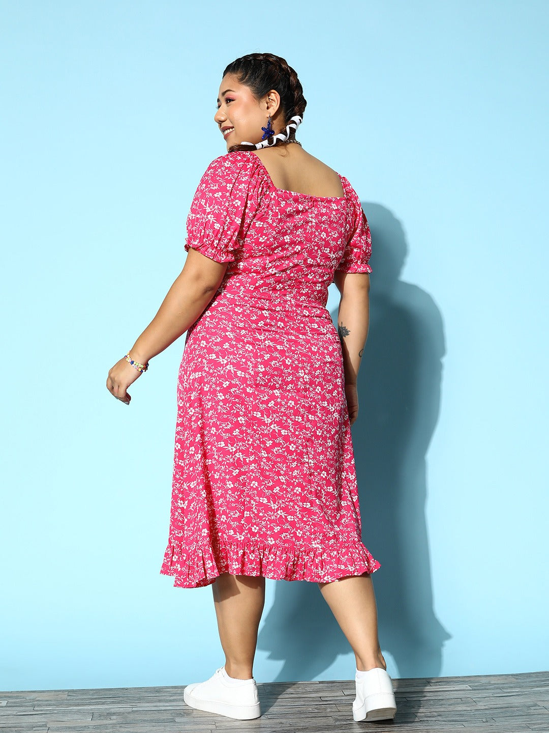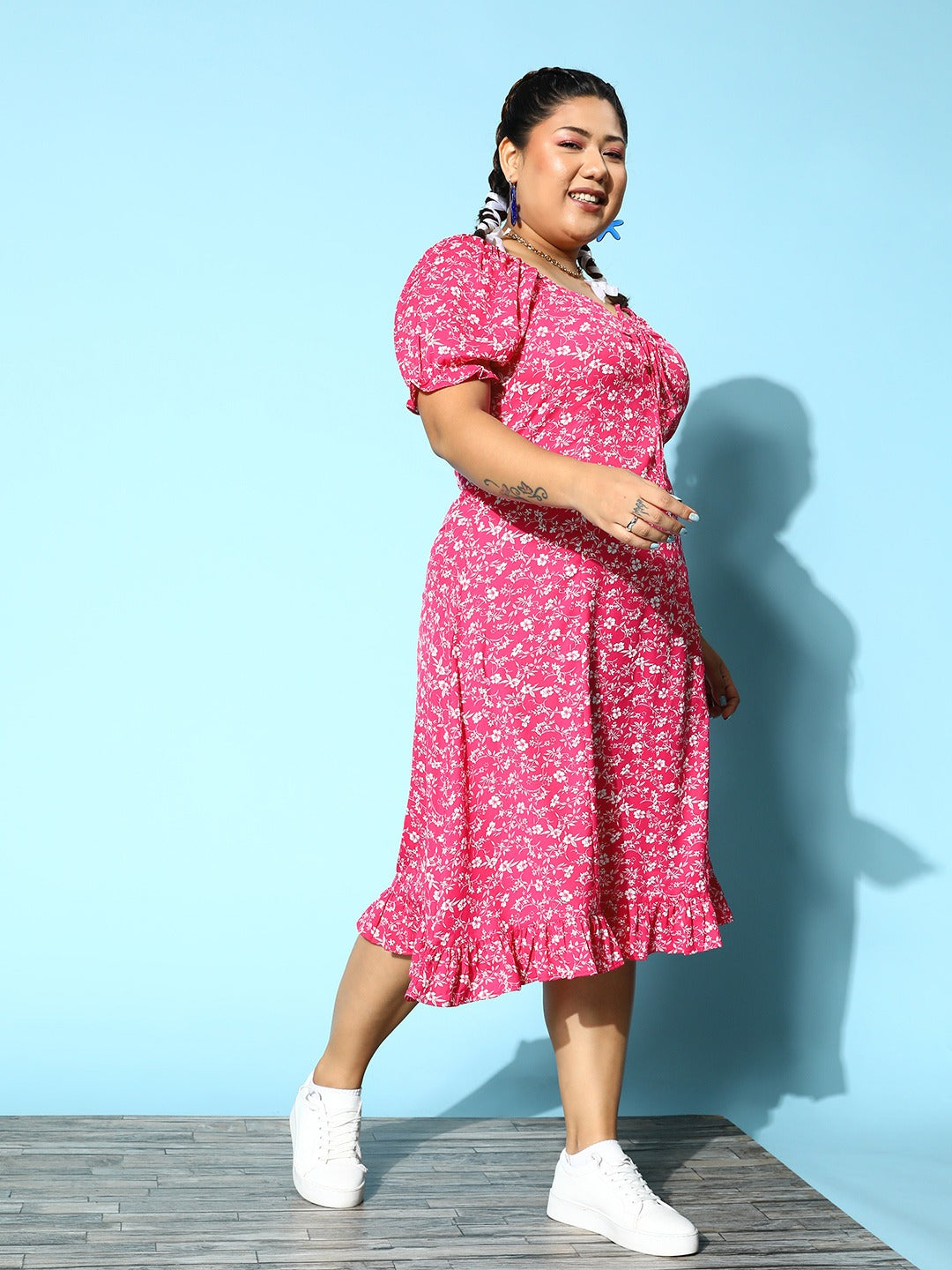 Berrylush Women Plus Size Pink & White Floral Printed Sweetheart Neck Front Tie-Up Flounce Hem A-Line Midi Dress