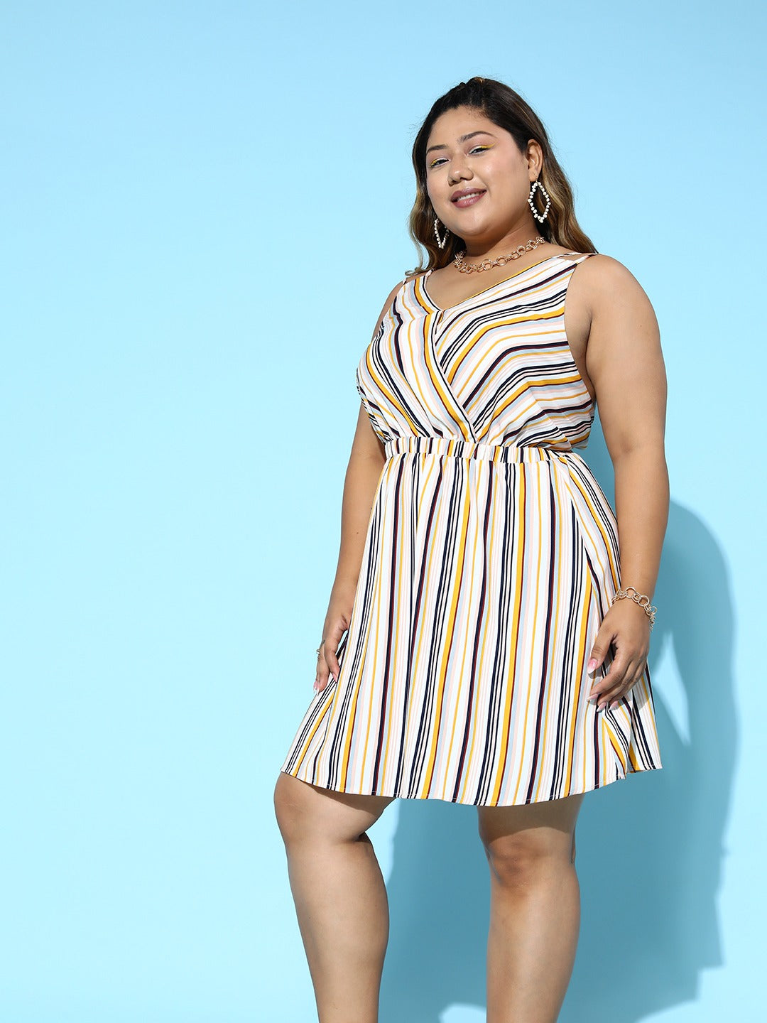 Berrylush Women Plus Size White & Multicolour Stripe Printed V-Neck Styled Back Straight Hem A-Line Mini Dress