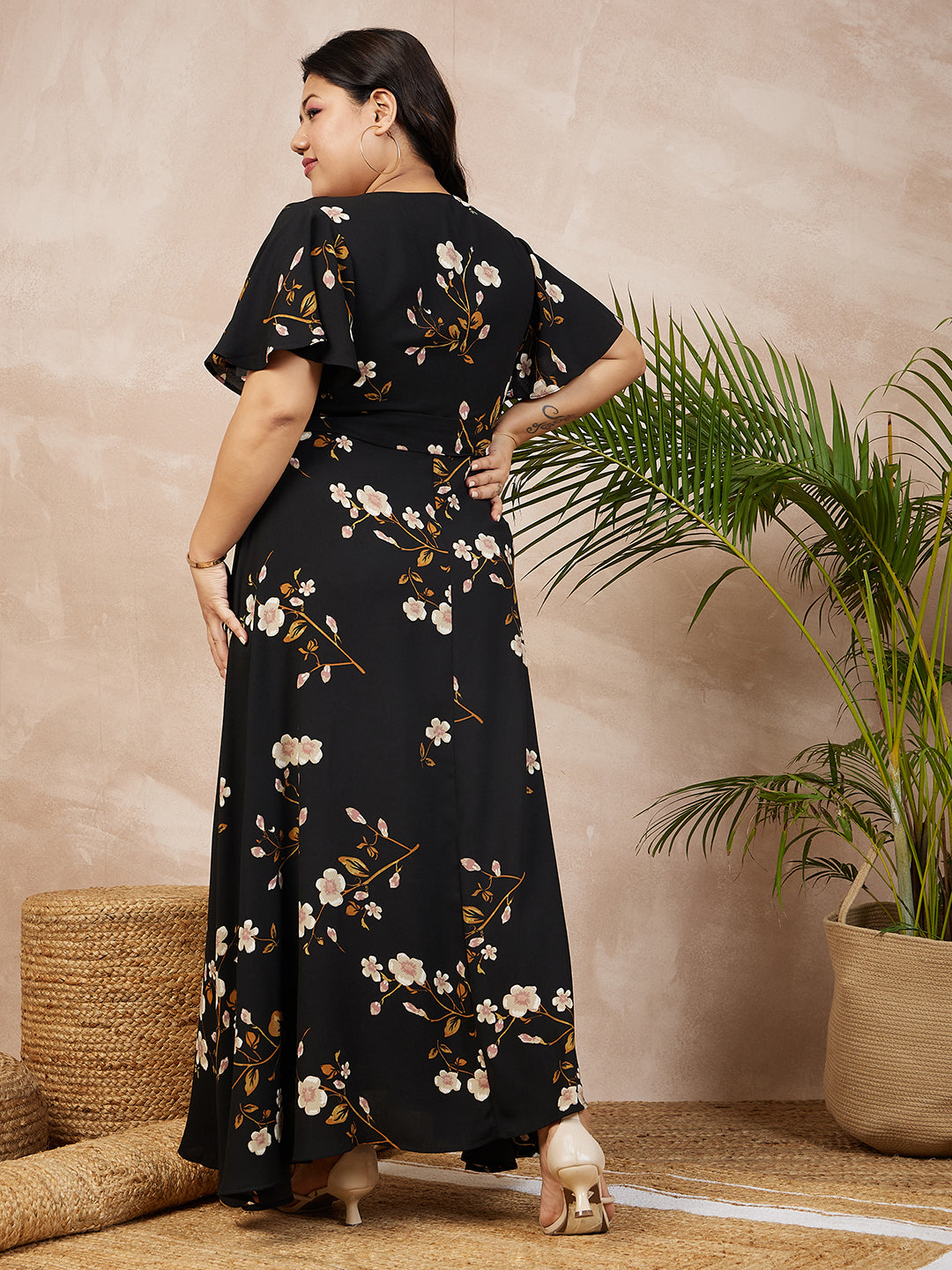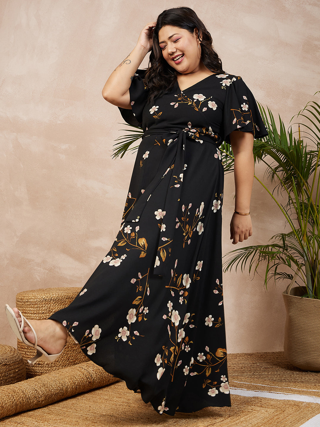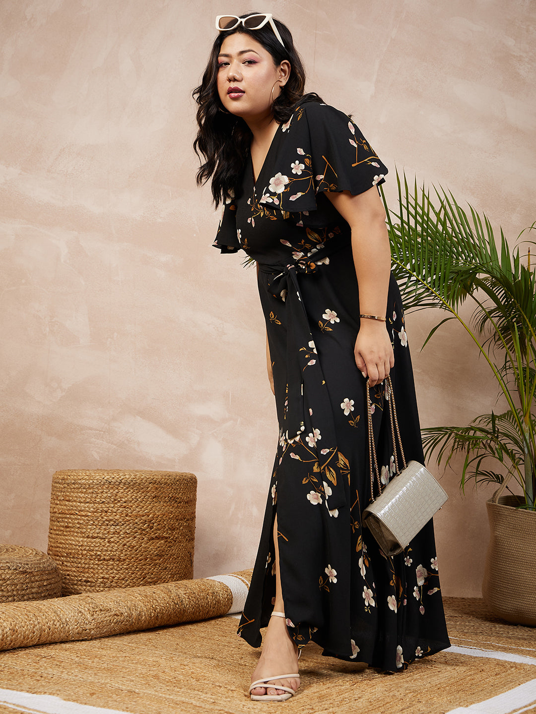 Berrylush Women Plus Size Black & White Floral Printed V-Neck Tie-Up Flutter Sleeve Thigh-High Slit Flared Wrap Maxi Dress