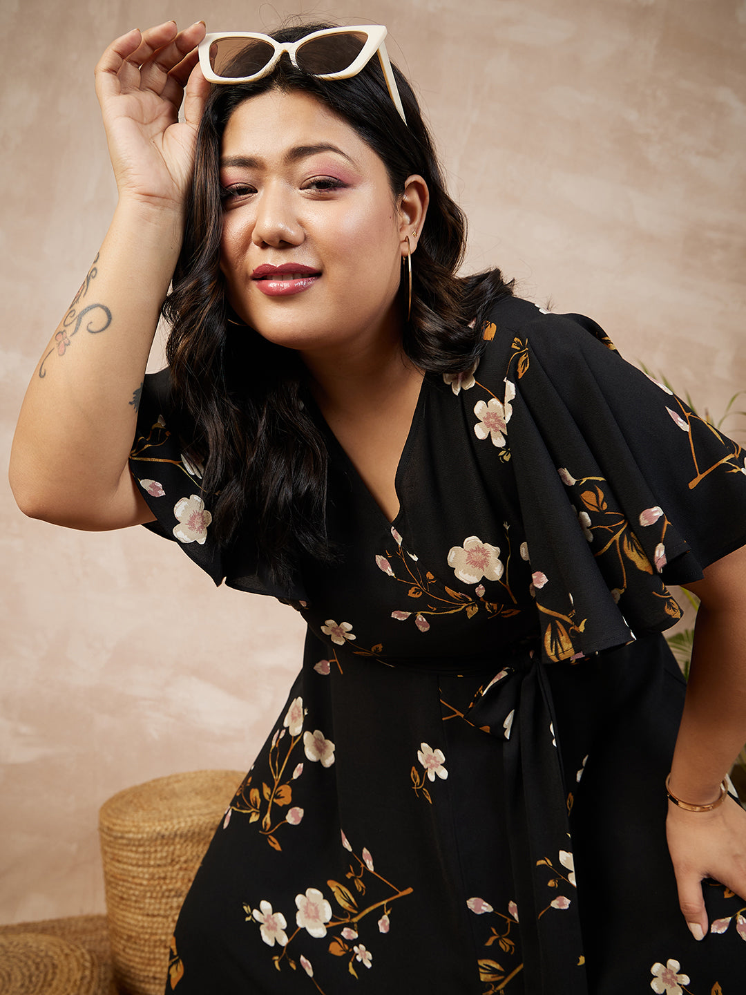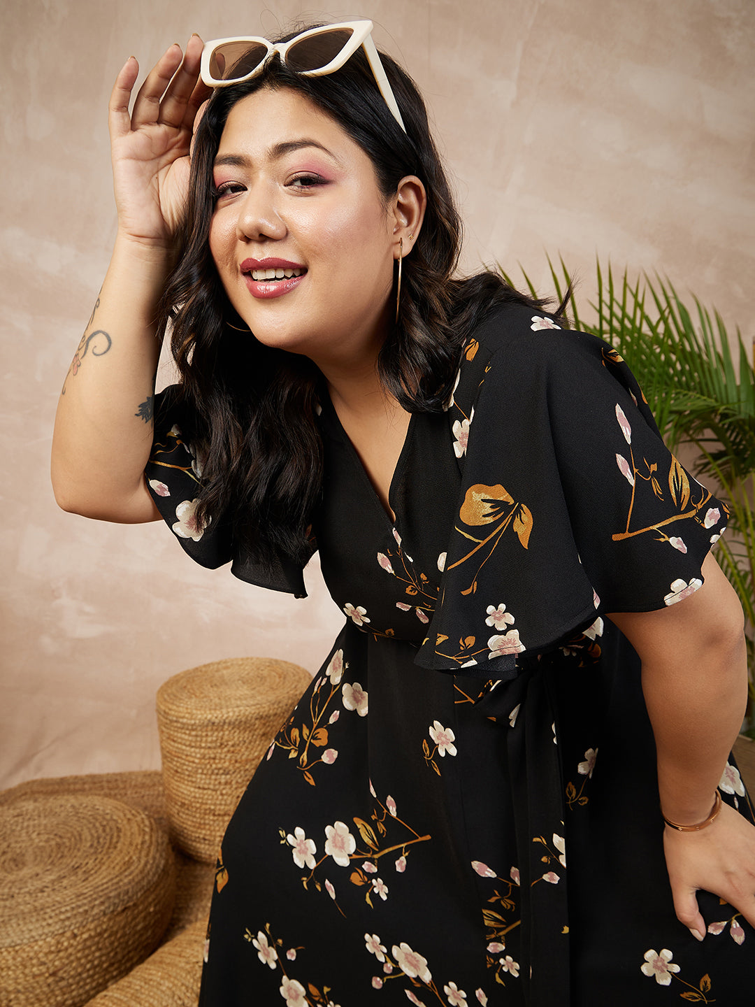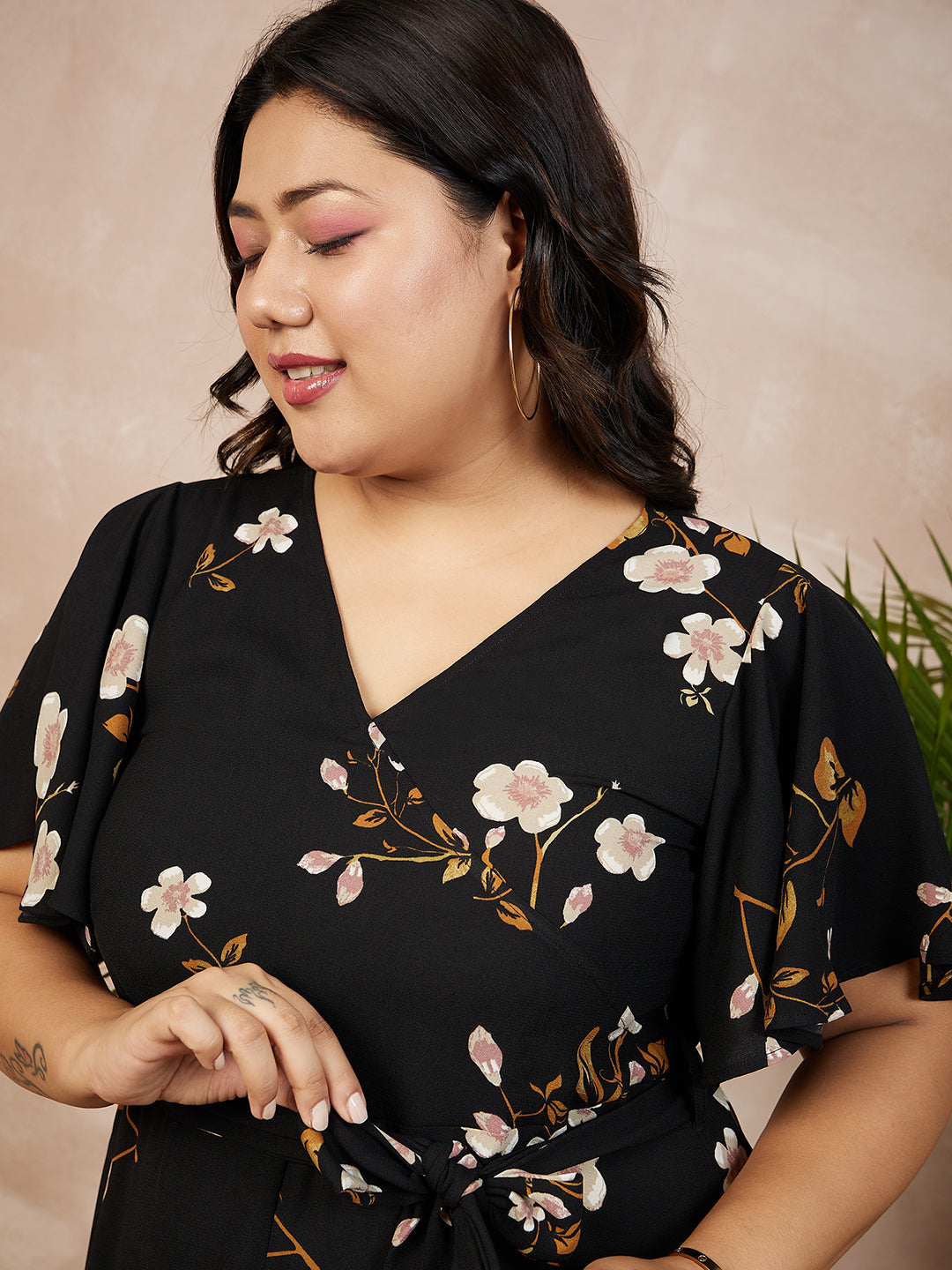 Berrylush Women Plus Size Black & White Floral Printed V-Neck Tie-Up Flutter Sleeve Thigh-High Slit Flared Wrap Maxi Dress