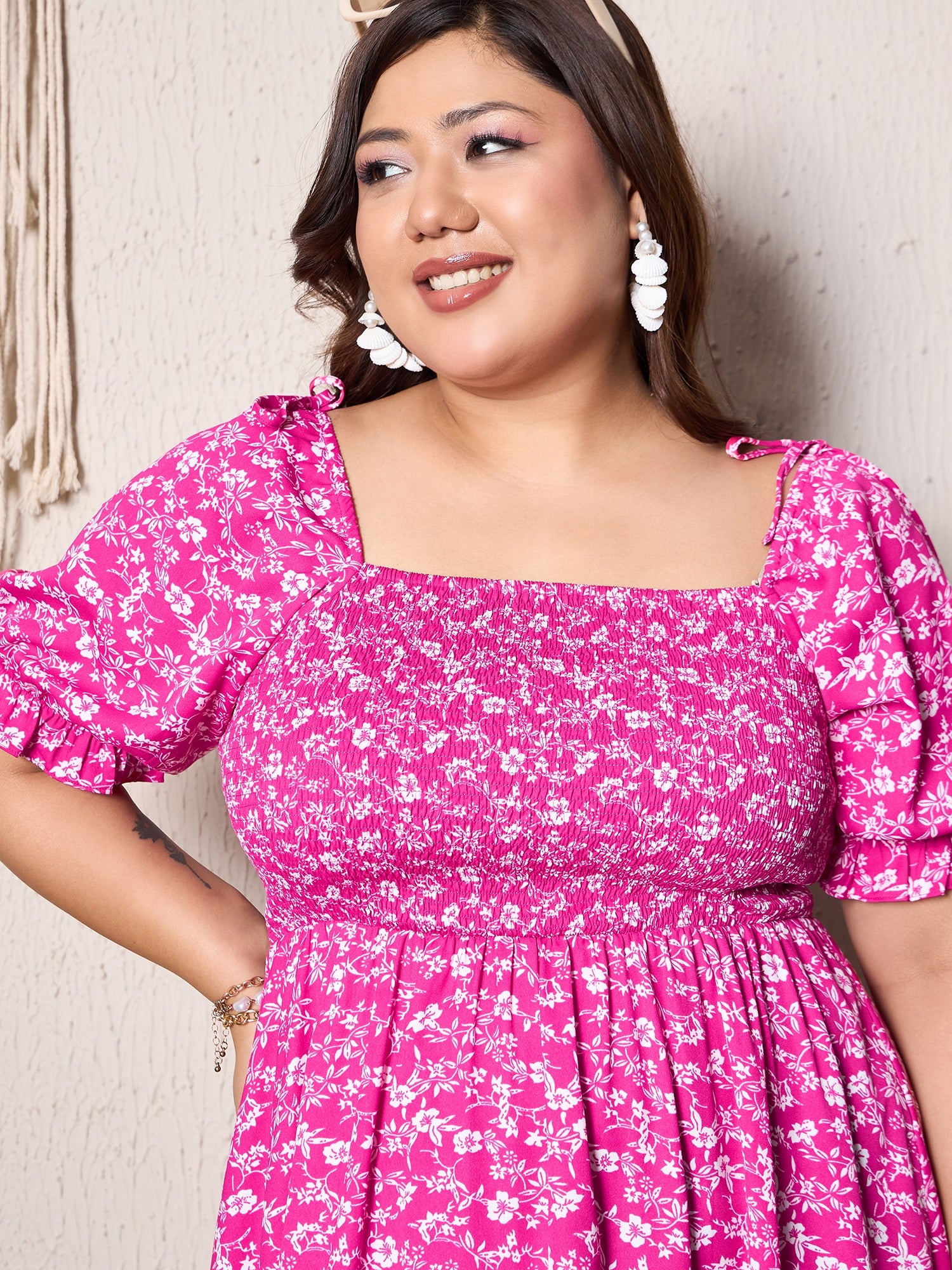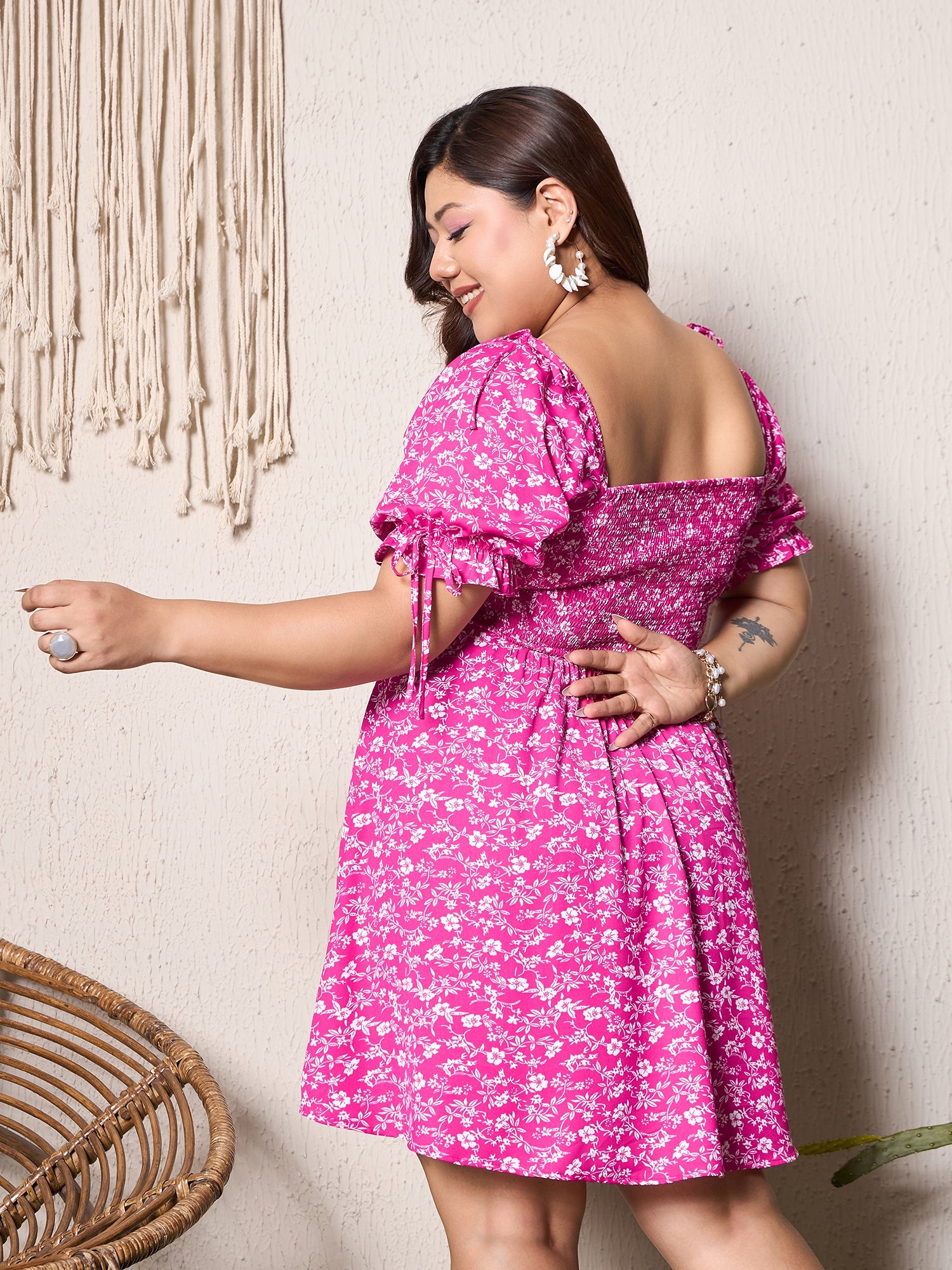 Berrylush Curve Women Pink & White Floral Printed Square Neck Bishop Sleeves Tie-Up Smocked A-Line Mini Dress