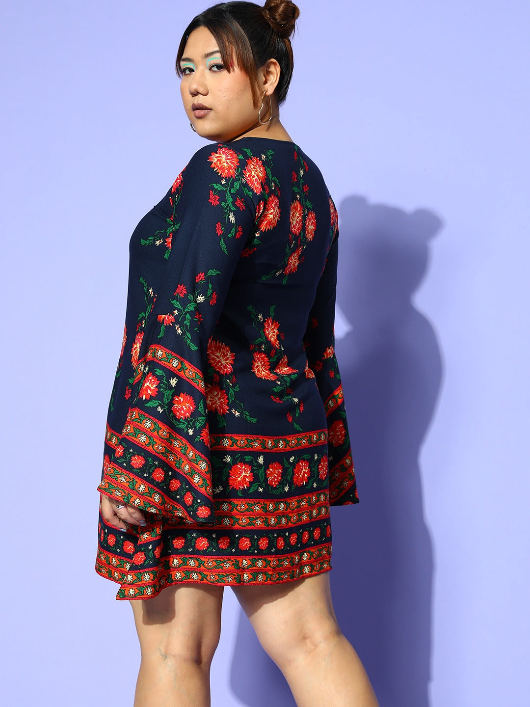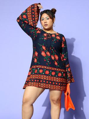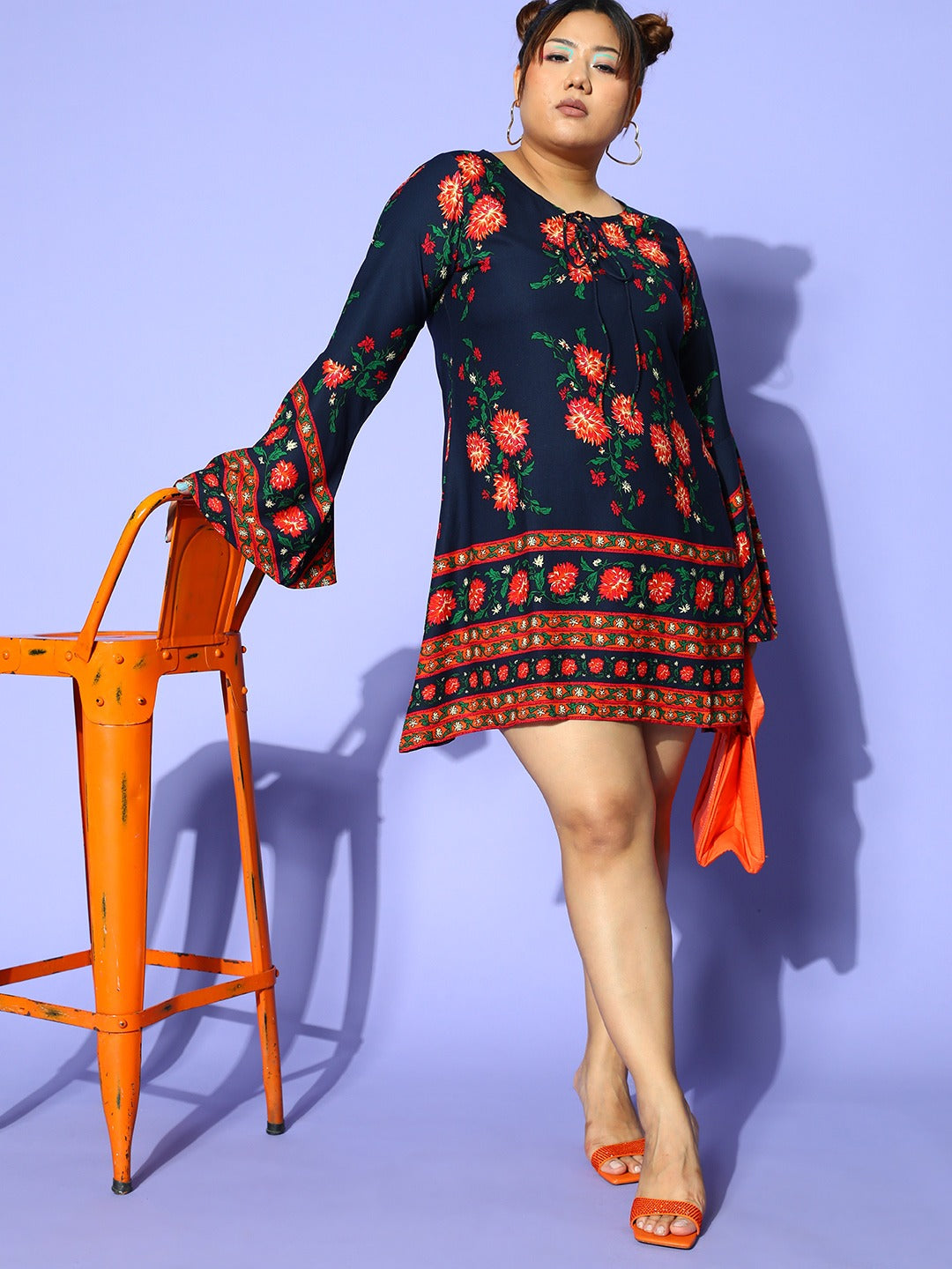 Berrylush Women Plus Size Navy Blue & Orange Floral Printed Tie-Up Neck Bell Sleeve Crepe Flared Mini Dress