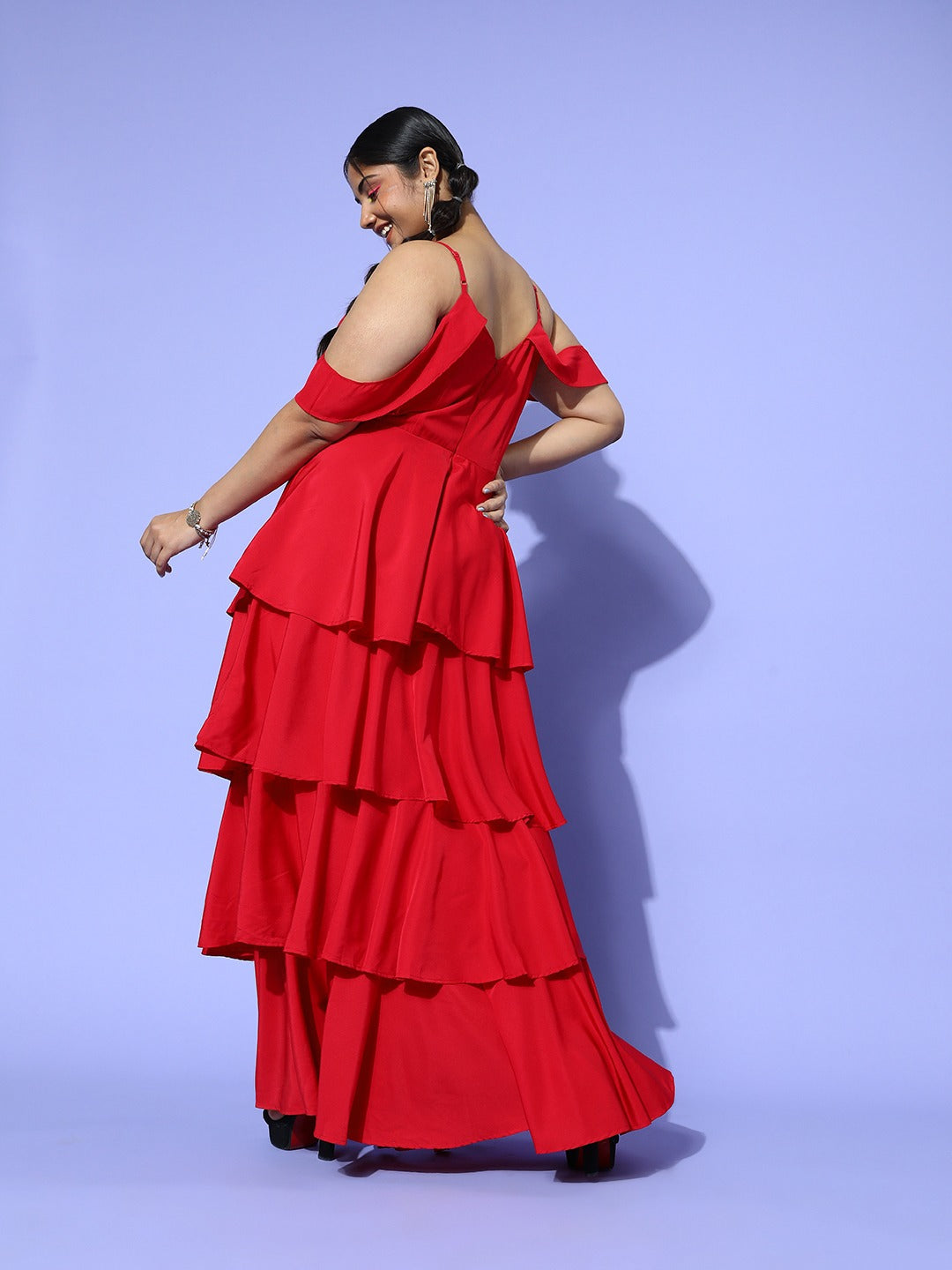 Berrylush Women Plus Size Solid Red V-Neck Cold-Shoulder Sleeves Flounce Hem Layered A-Line Maxi Dress