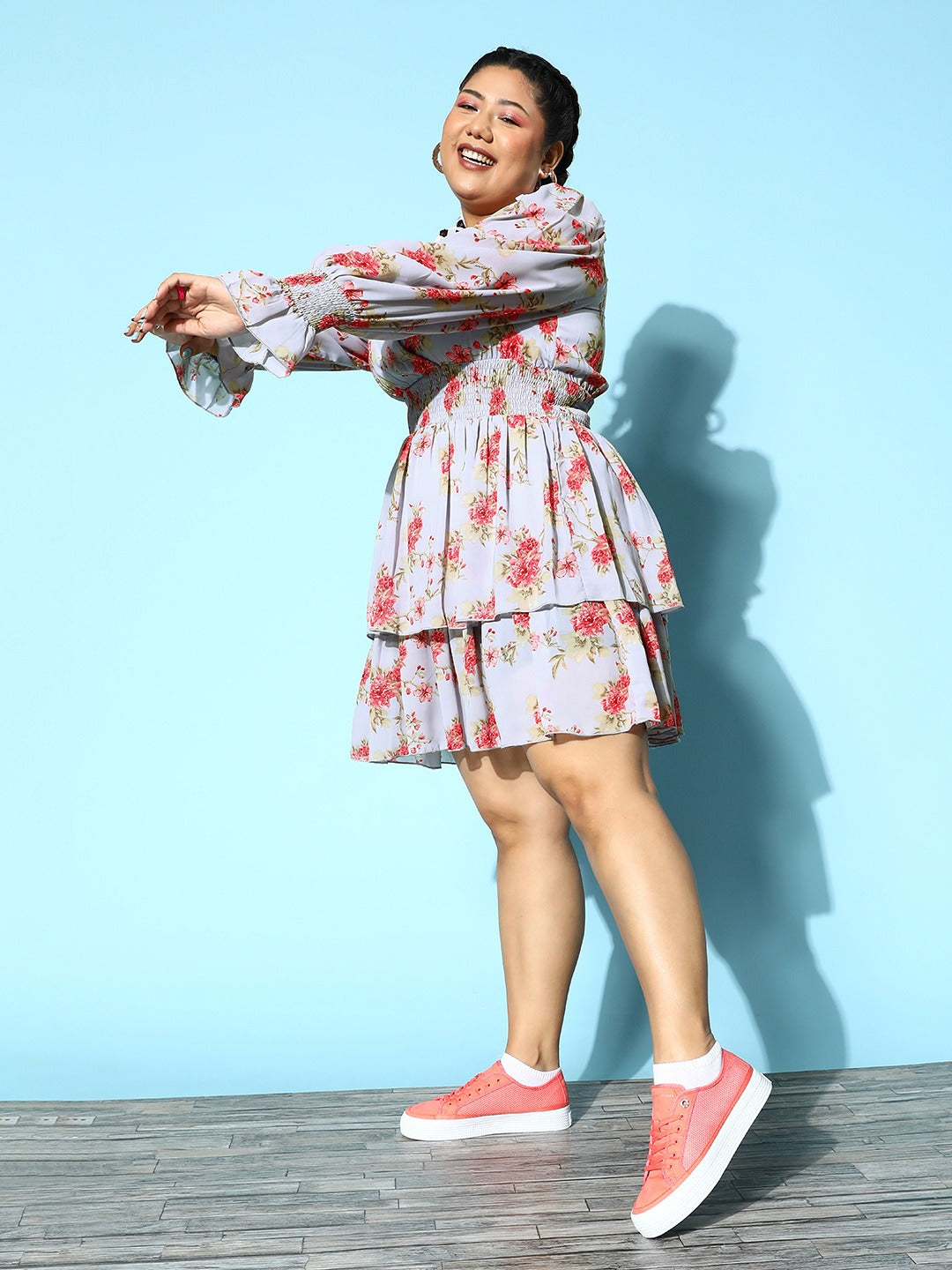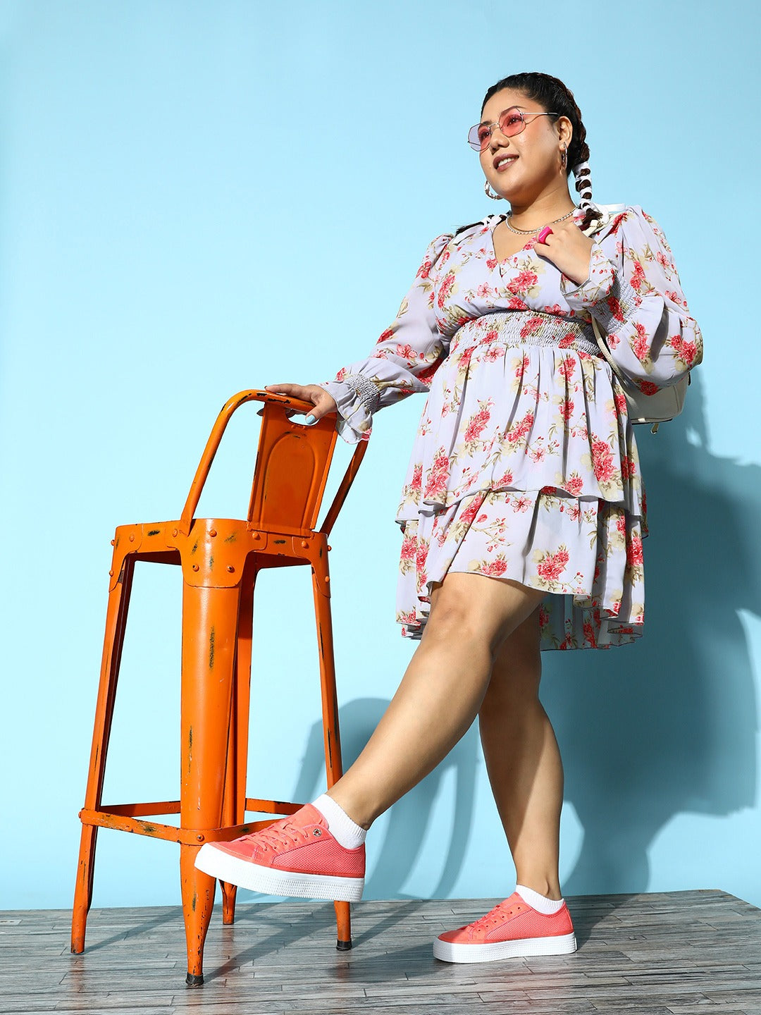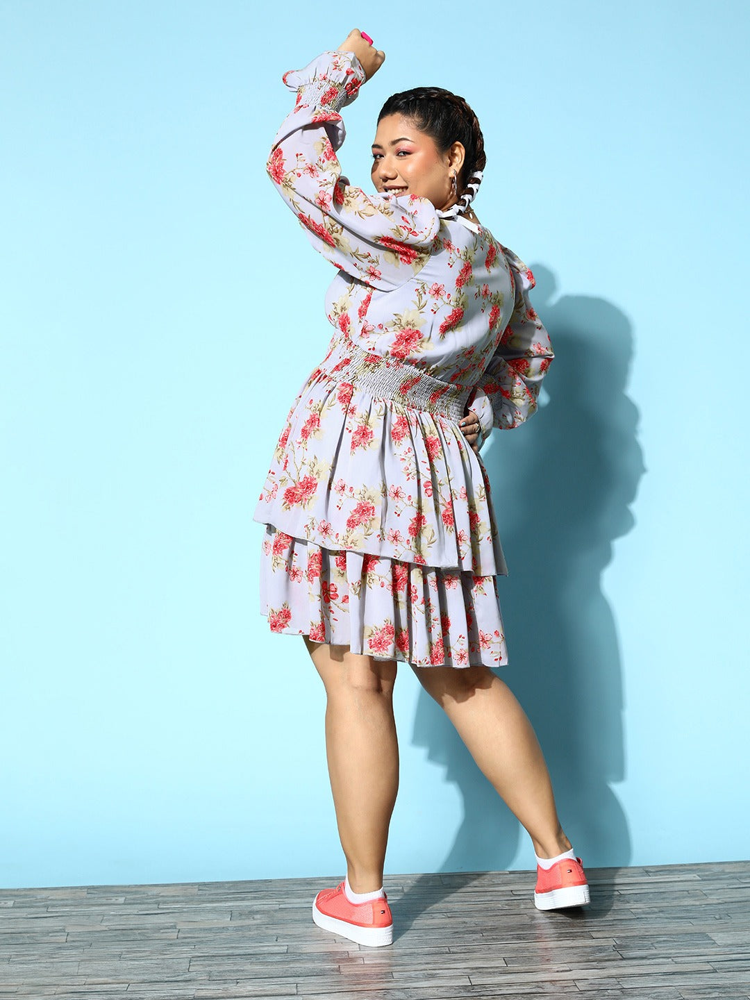 Berrylush Women Plus Size Blue & Pink Floral Printed V-Neck Flounce Hem Tiered Wrap Mini Dress