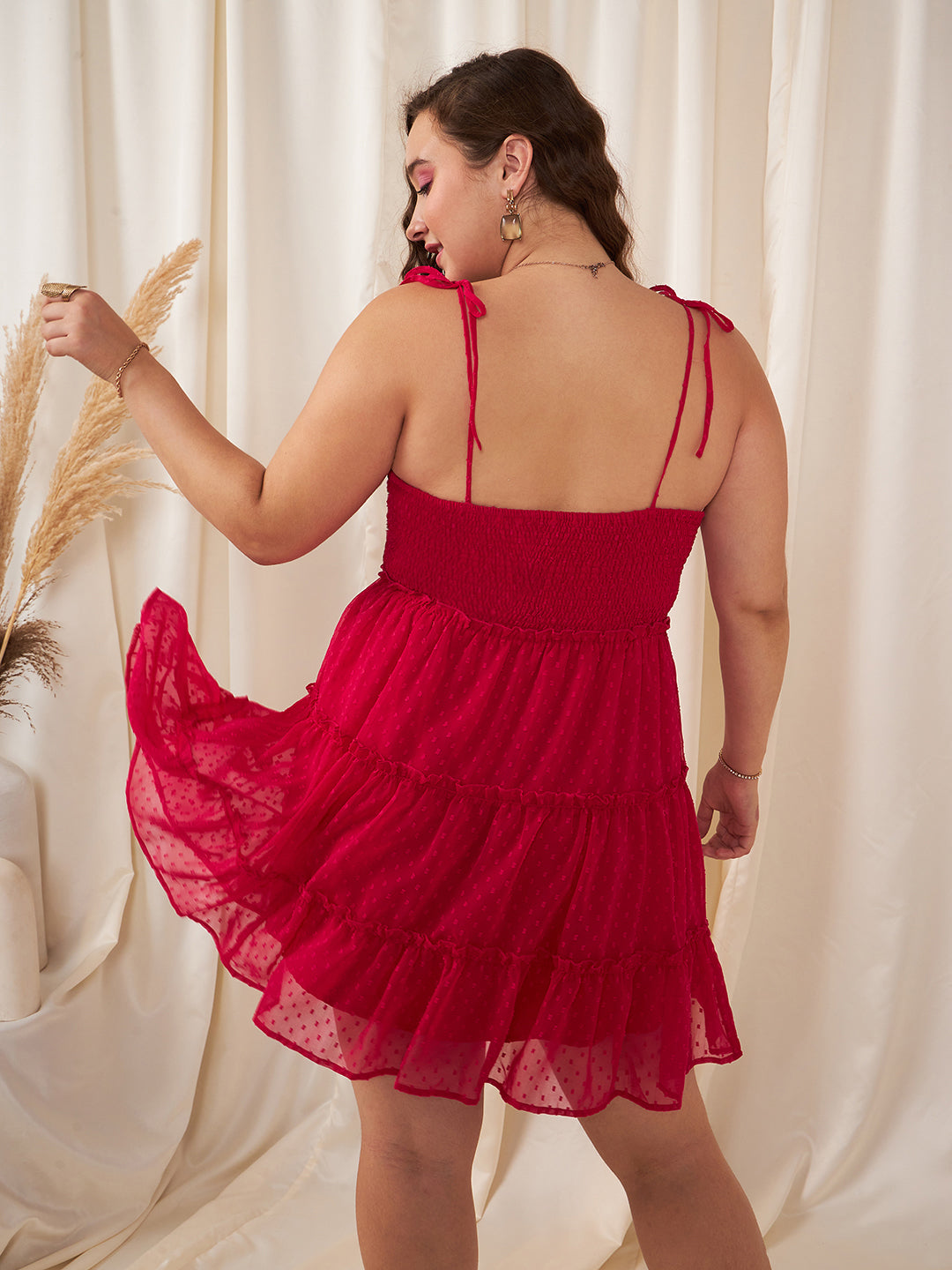 Berrylush Women Plus Size Solid Pink Dobby Weave Round Neck Tie-Up Strap Georgette Pleated Fit & Flare Mini Dress