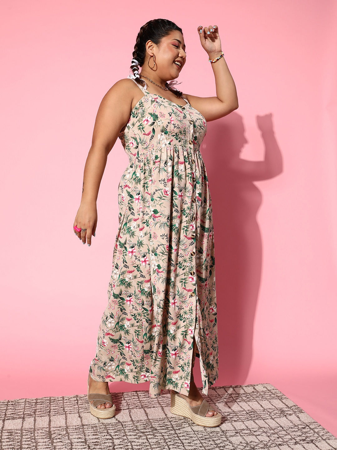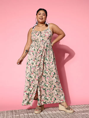 Uplift the fashionable charm of your casual assortment with elegant and impeccable details by picking this pretty Pink and Green Floral Printed Flared Woven Maxi Dress from Berrylush. Sculpted in a maxi frame that lends this dress a universally flattering appeal with eye-catching coverage to your legs. Styled with shoulder straps that assemble a practical design to support this dress with a contemporary charm. In addition, the flared hemline gives this dress an admiring design with beautiful flair and a bouncy drape. Enjoy your time watching the sunset with your love while looking gorgeous by teaming this dress with pink sandals, cute butter earrings, and a tote bag.